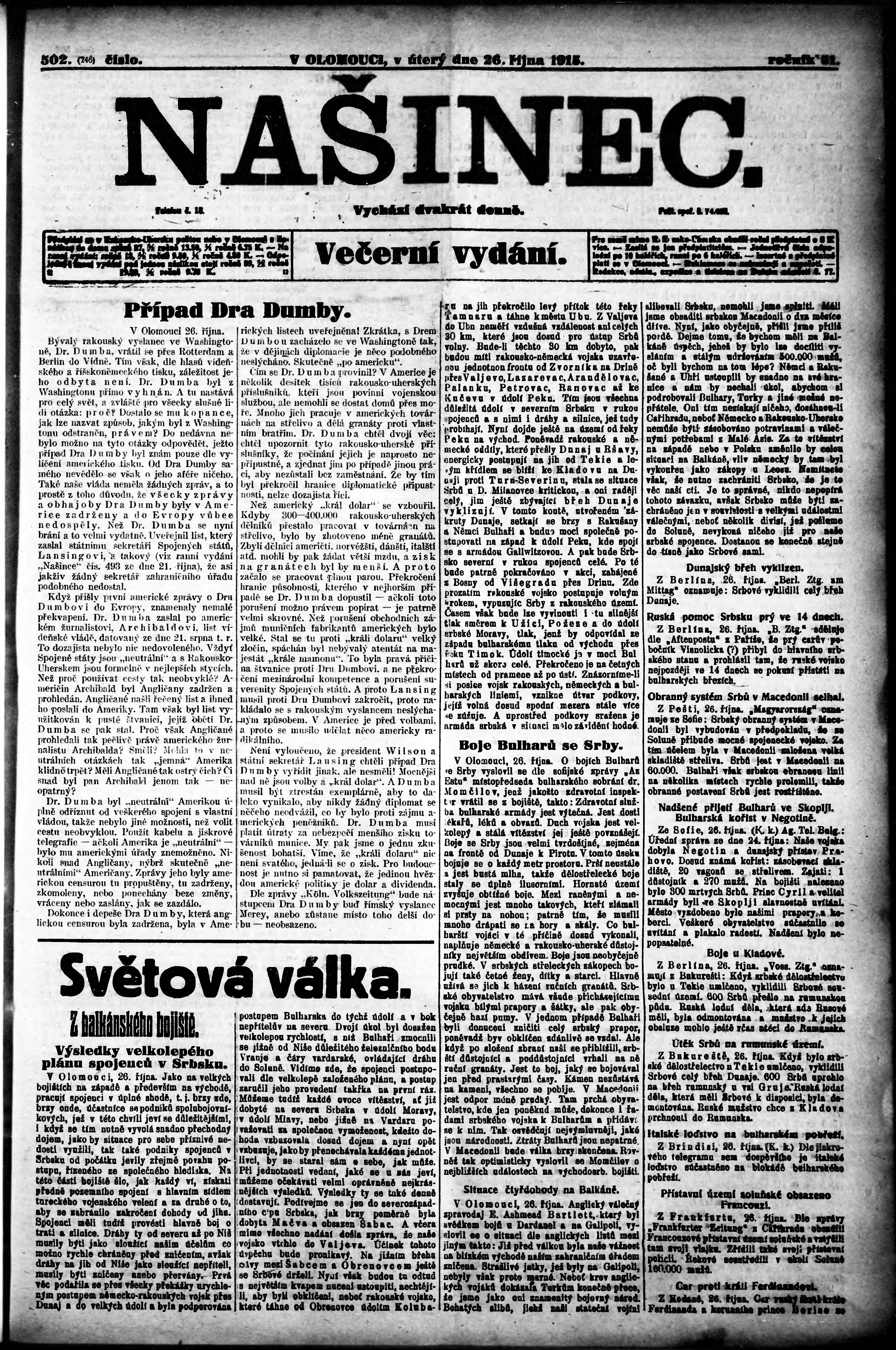 * Datum vydání výtisku: 26.10.1915 Číslo výtisku: 502 Poznámky k výtisku: večerní vydání;