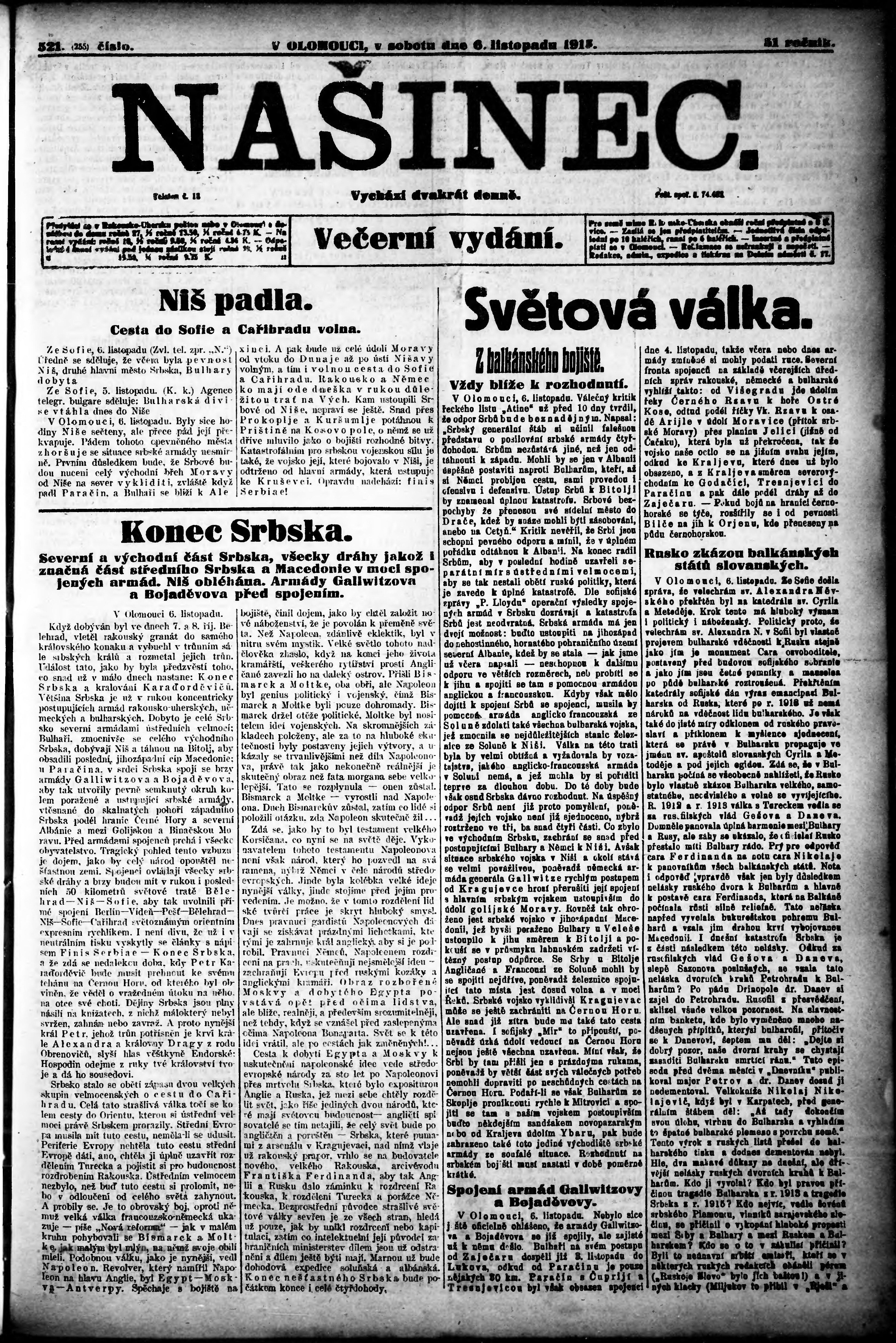 * Datum vydání výtisku: 6.11.1915 Číslo výtisku: 521 Poznámky k výtisku: večerní vydání;