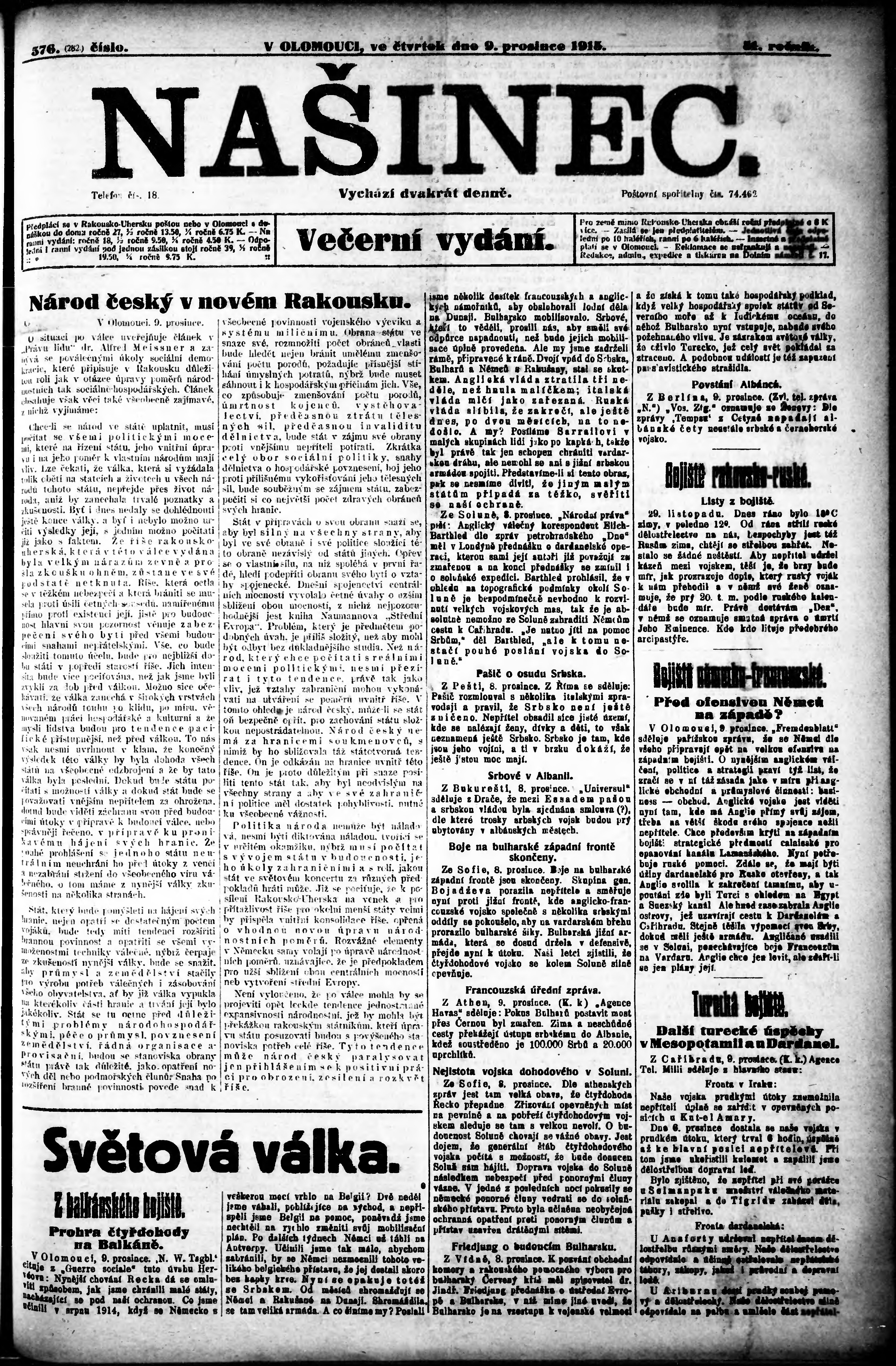 * Datum vydání výtisku: 9.12.1915 Číslo výtisku: 576 Poznámky k výtisku: večerní vydání;