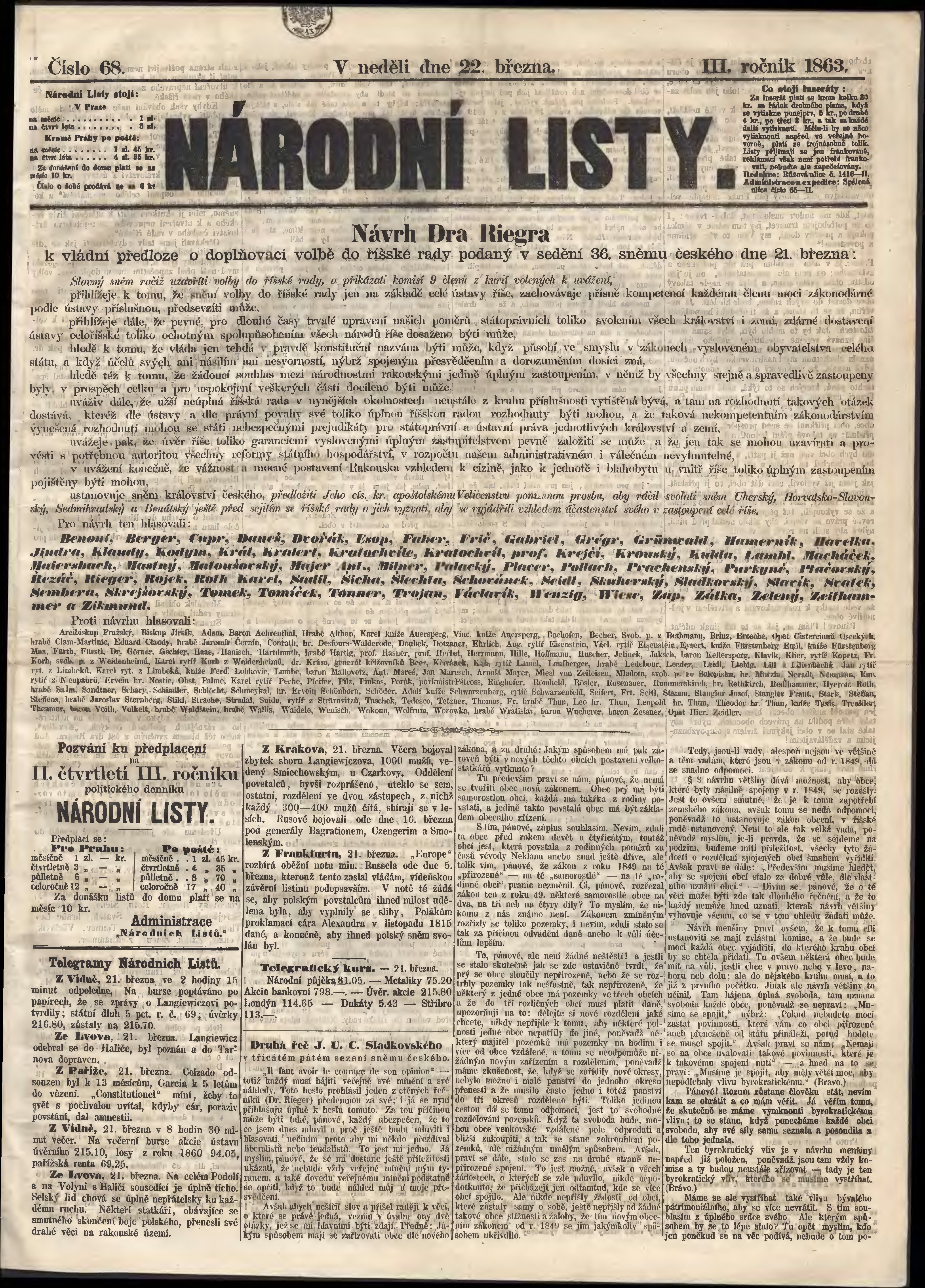 * Datum vydání výtisku: 22.3.1863 Číslo výtisku: 68