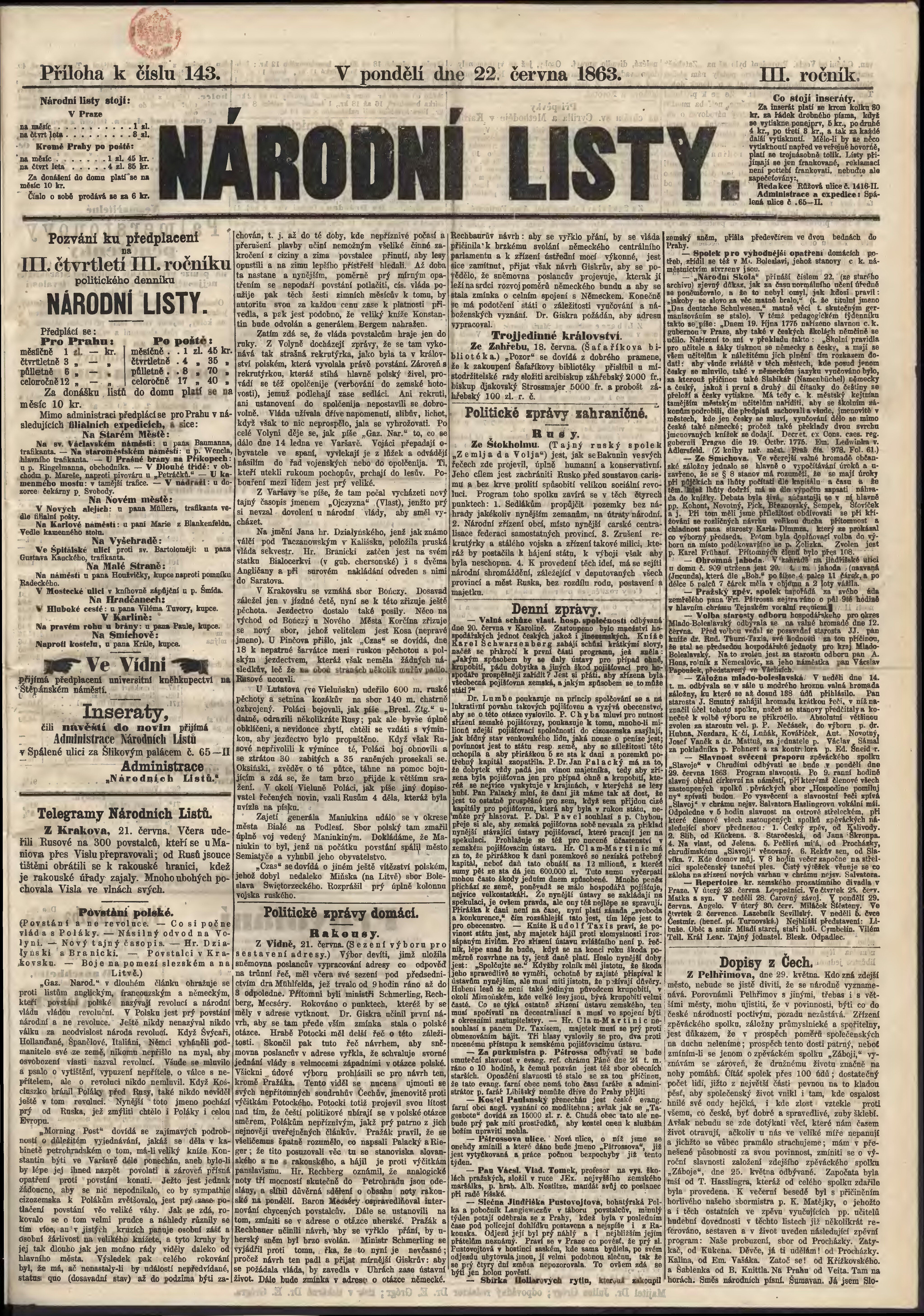 * Datum vydání výtisku: 22.6.1863 Číslo výtisku: 143 Typ výtisku: příloha