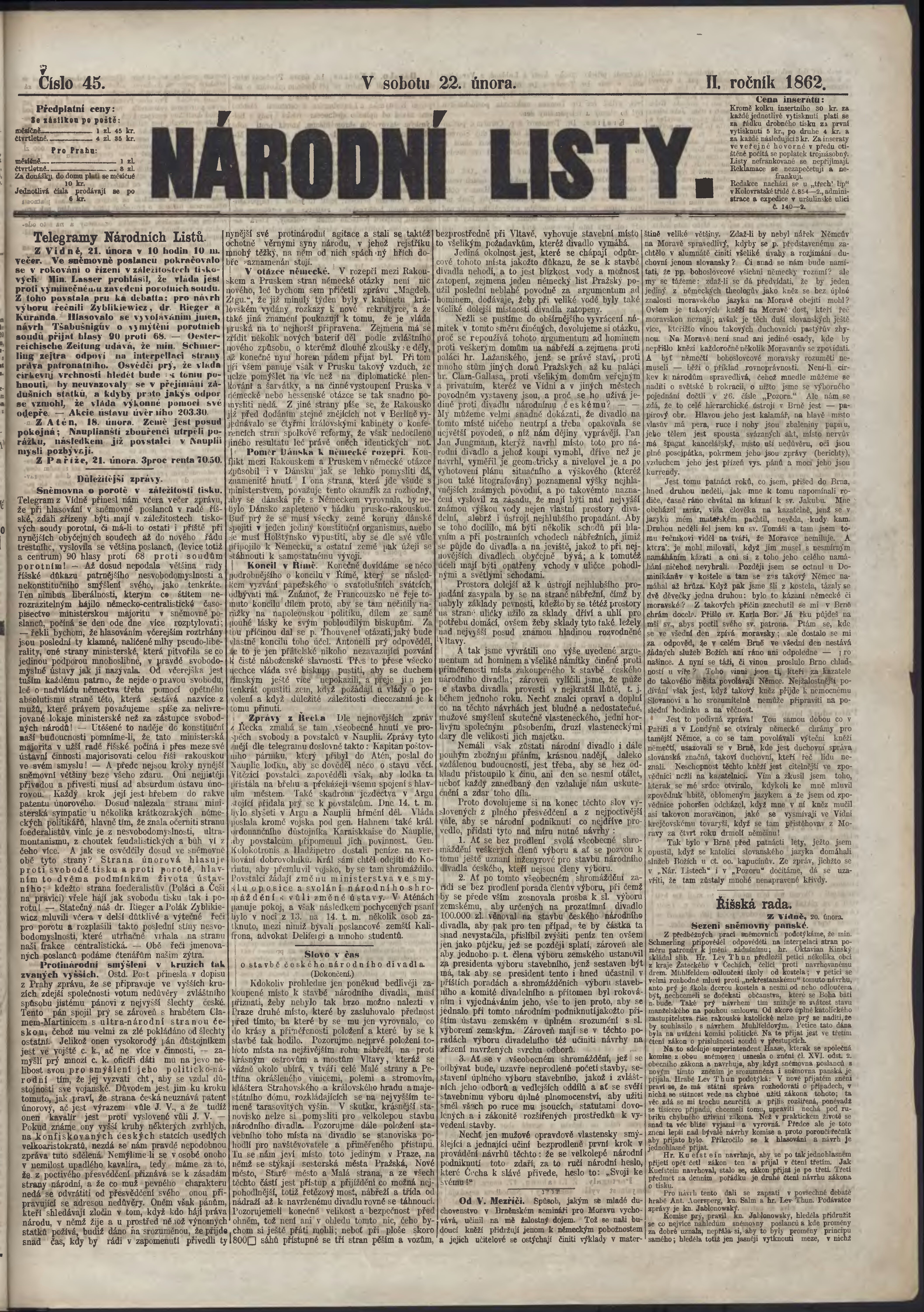 * Datum vydání výtisku: 22.2.1862 Číslo výtisku: 45