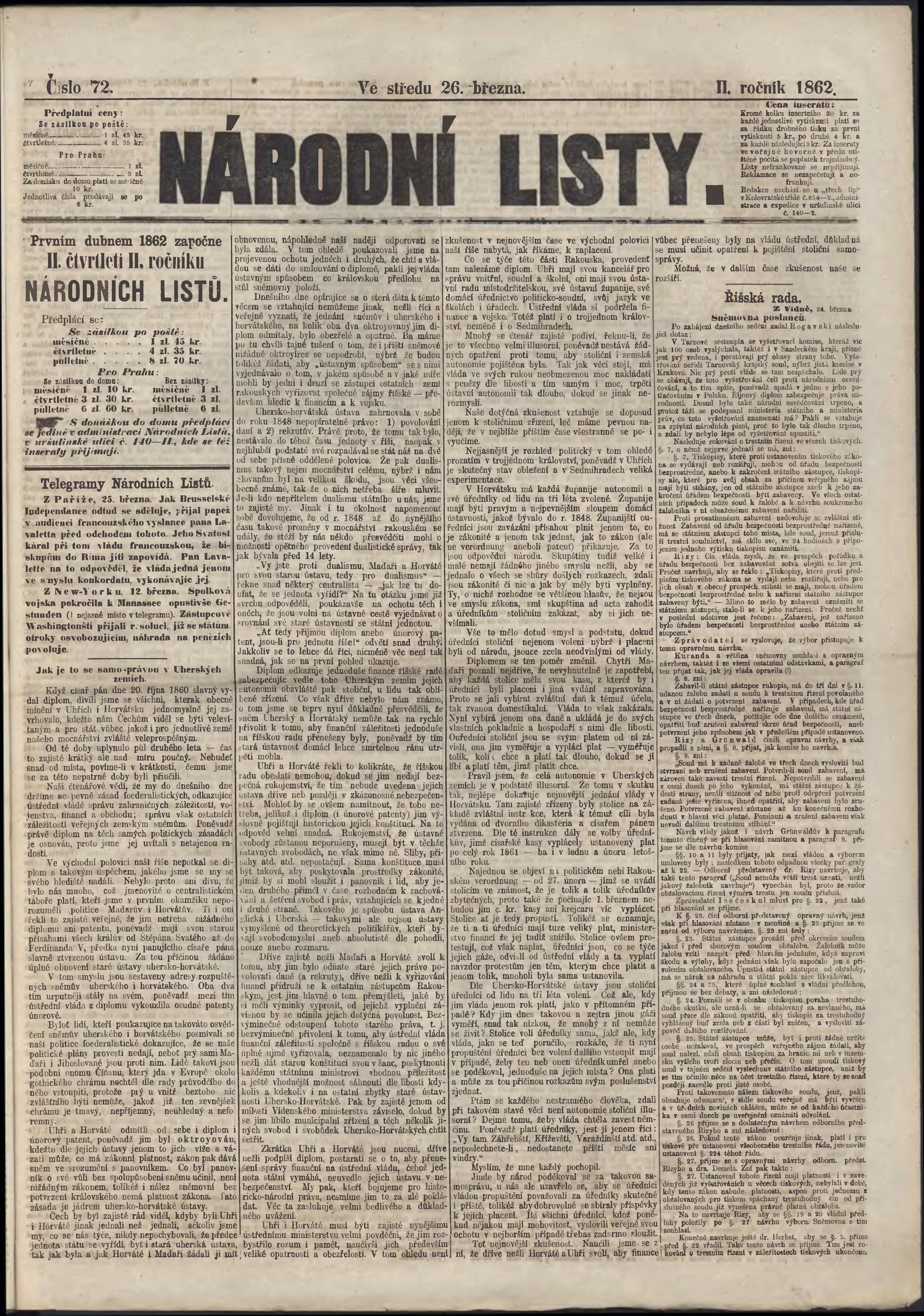 * Datum vydání výtisku: 26.3.1862 Číslo výtisku: 72