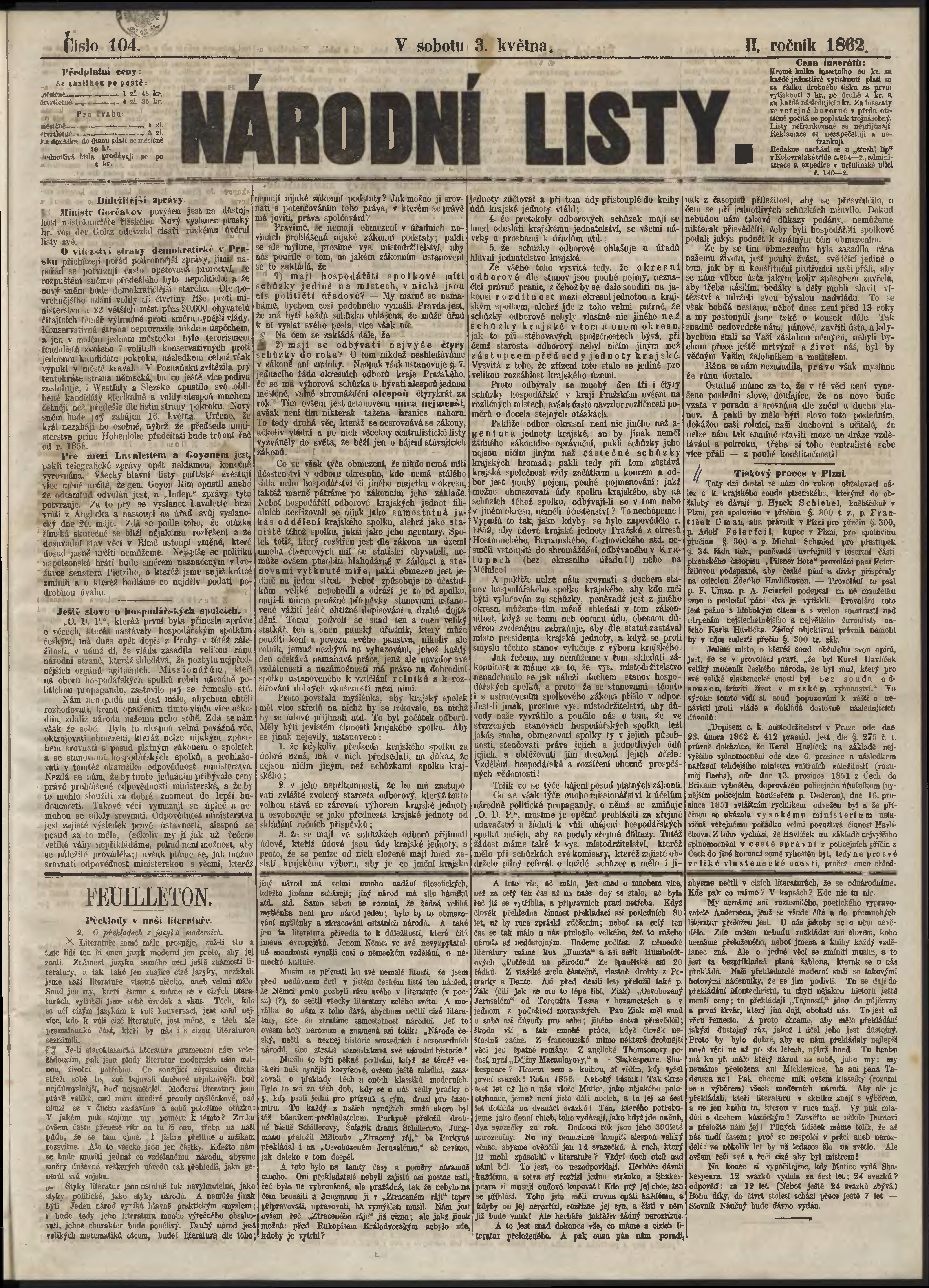 * Datum vydání výtisku: 3.5.1862 Číslo výtisku: 104