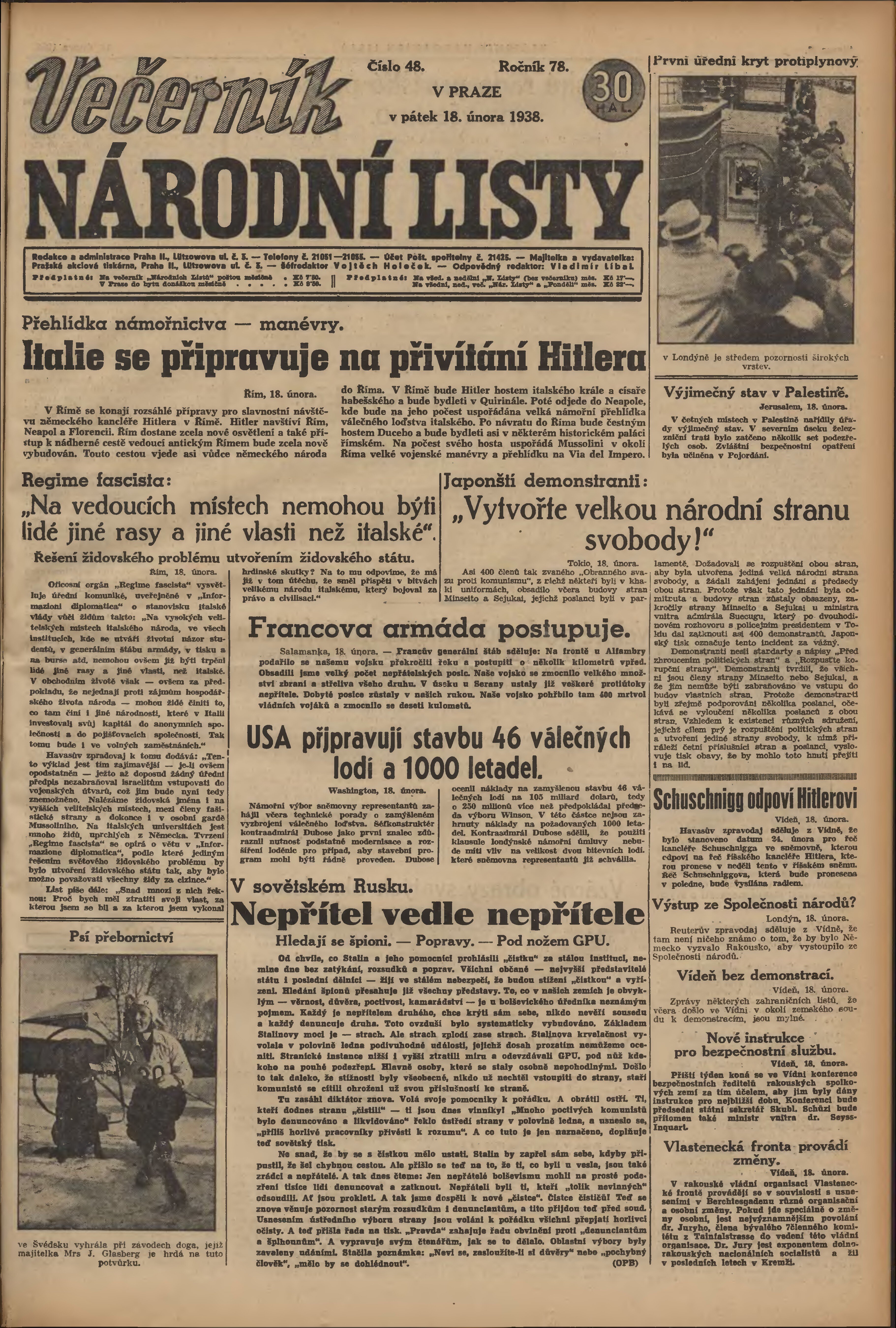 * Datum vydání výtisku: 18.2.1938 Číslo výtisku: 48 Poznámky k výtisku: večerní vydání;