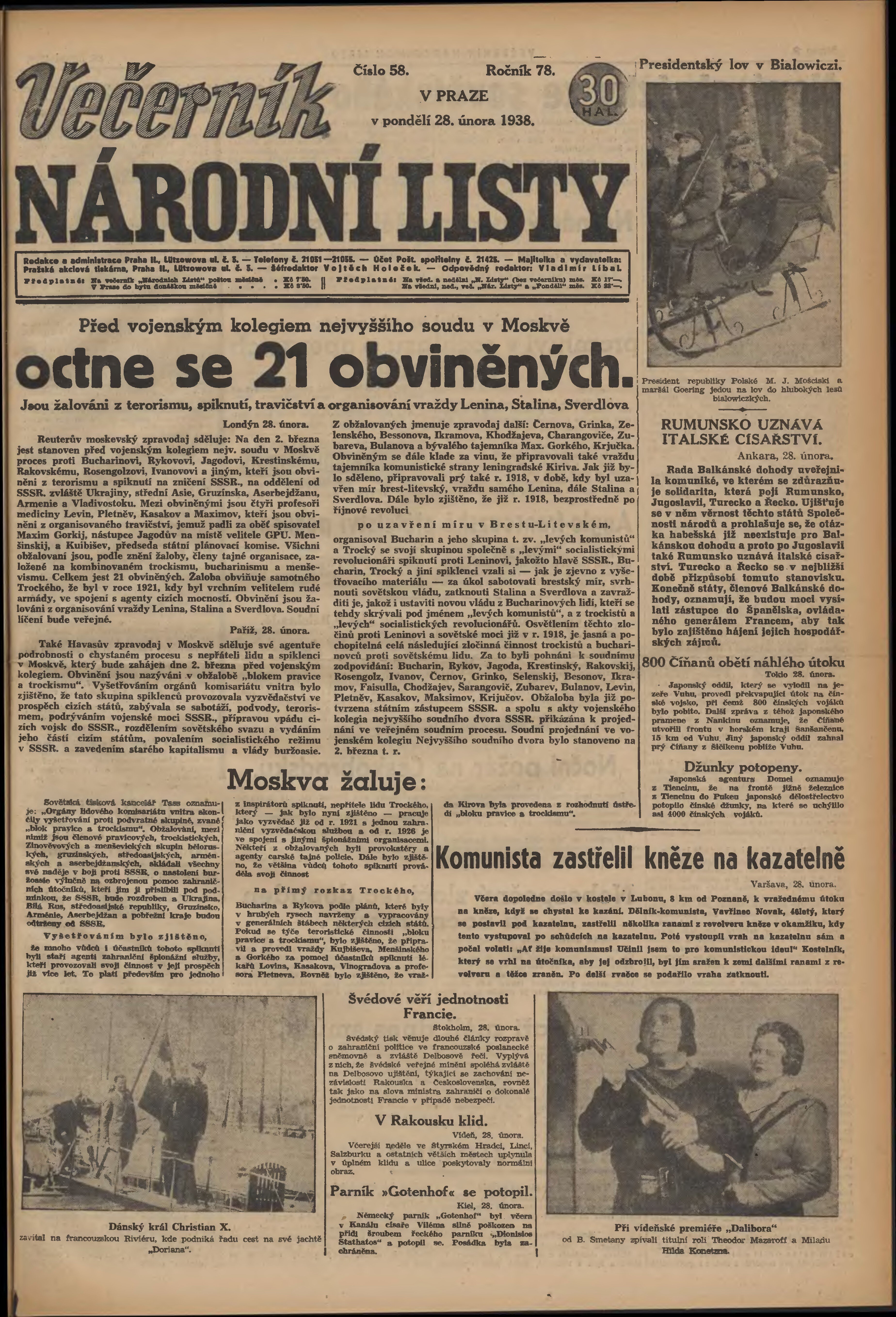 * Datum vydání výtisku: 28.2.1938 Číslo výtisku: 58 Poznámky k výtisku: večerní vydání;