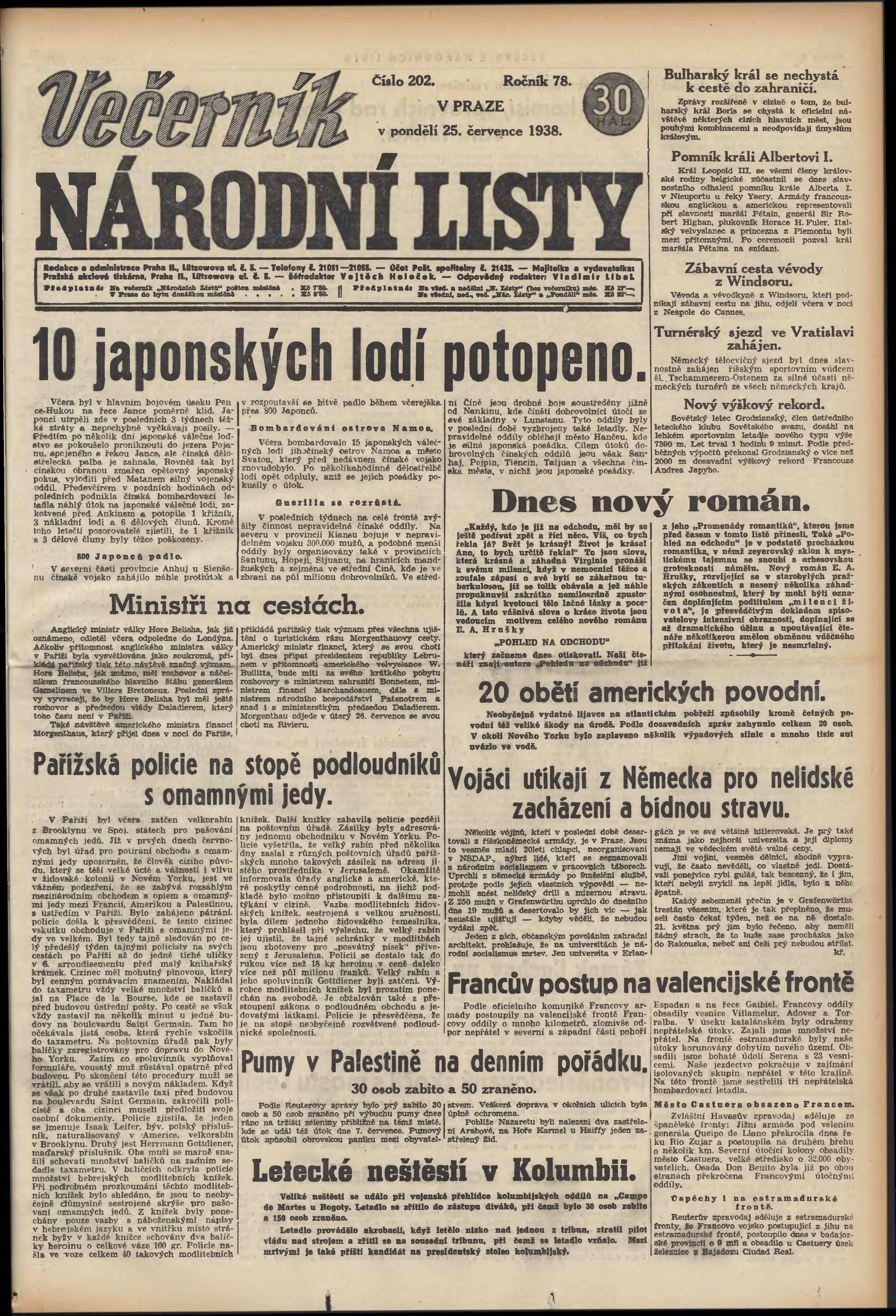 * Datum vydání výtisku: 25.7.1938 Číslo výtisku: 202 Poznámky k výtisku: večerní vydání;