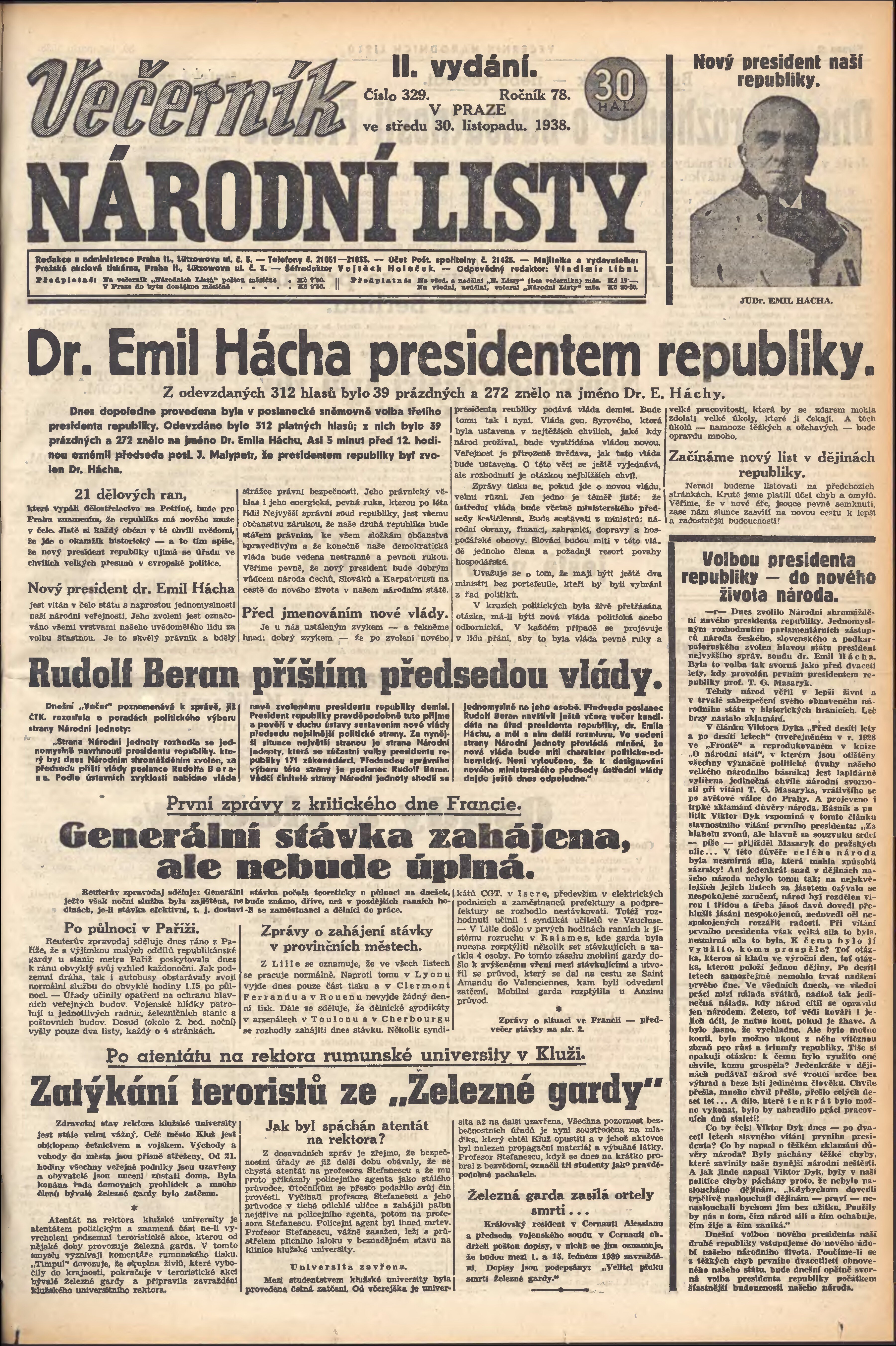 * Datum vydání výtisku: 30.11.1938 Číslo výtisku: 329 Poznámky k výtisku: večerní vydání; 2. vydání;