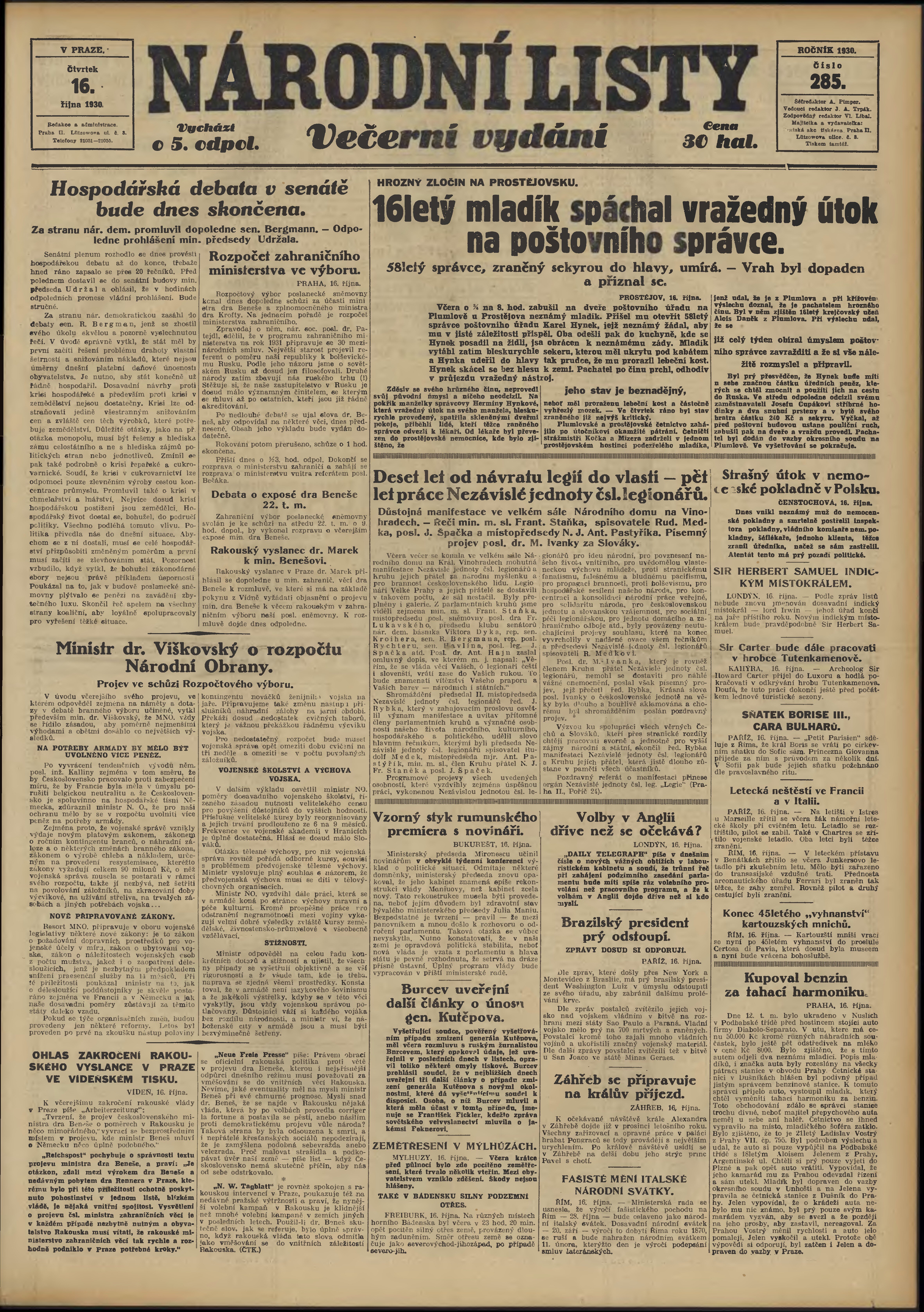 * Datum vydání výtisku: 16.10.1930 Číslo výtisku: 285 Poznámky k výtisku: večerní vydání;