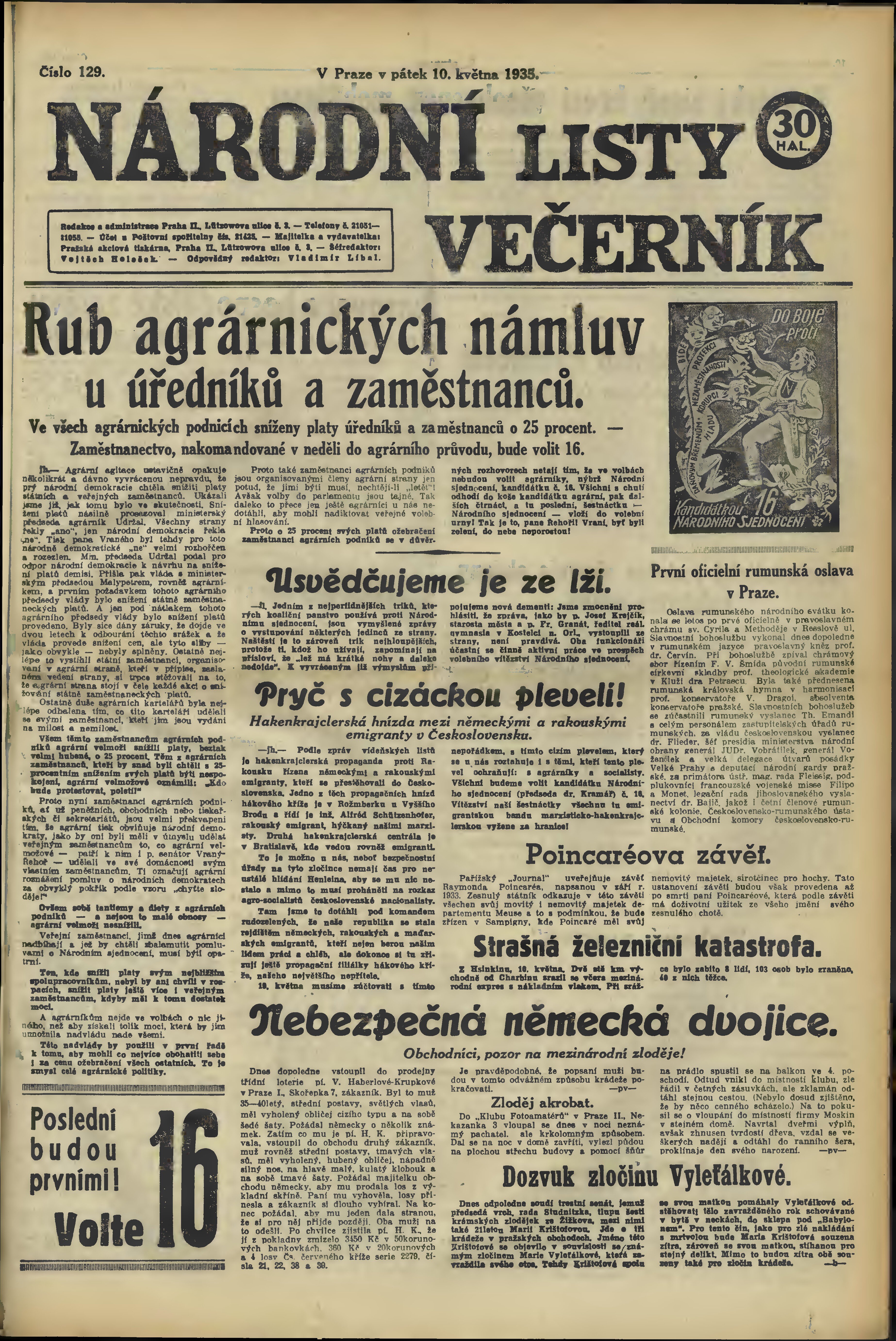* Datum vydání výtisku: 10.5.1935 Číslo výtisku: 129 Poznámky k výtisku: večerní vydání;