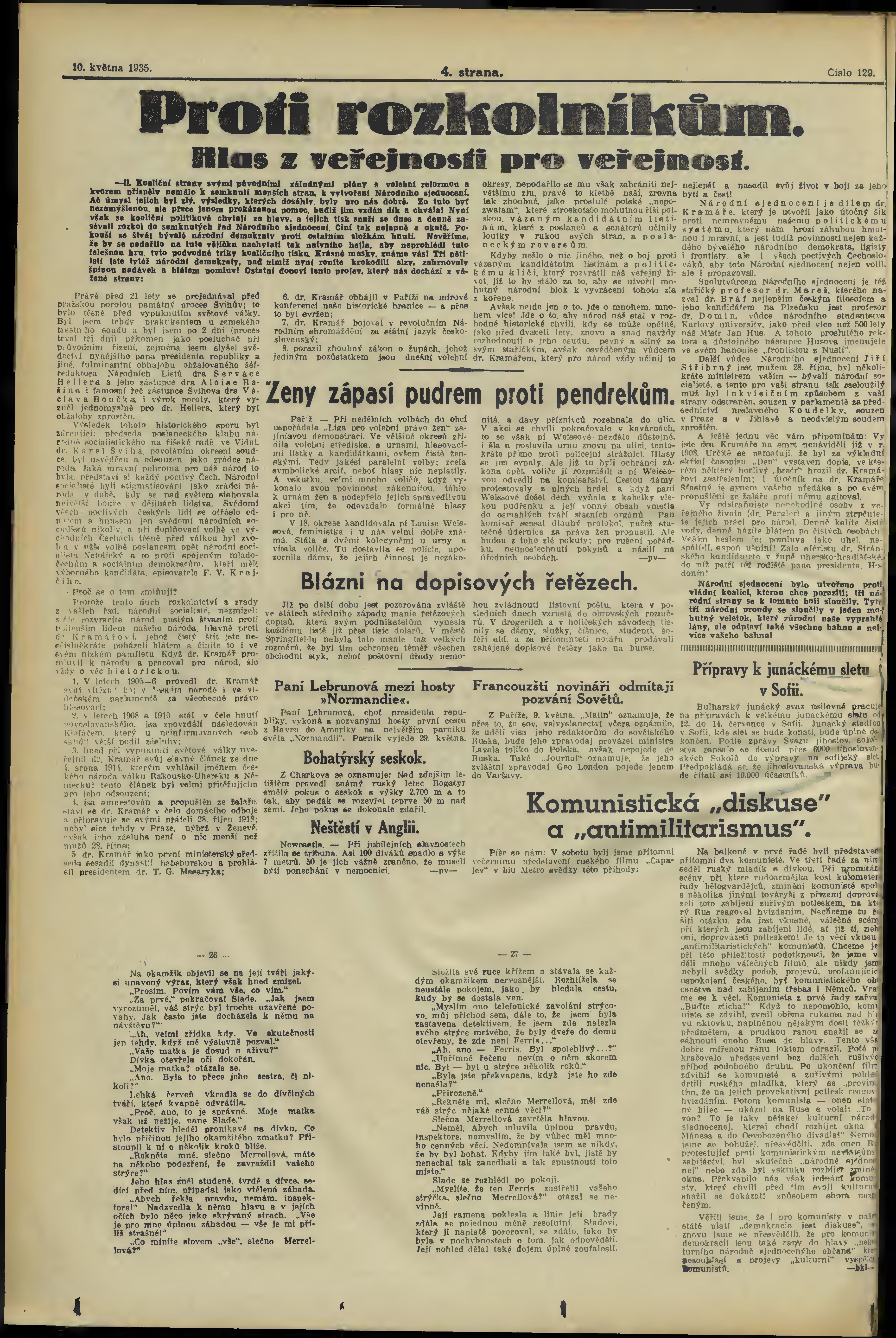 * Datum vydání výtisku: 10.5.1935 Číslo výtisku: 129 Poznámky k výtisku: večerní vydání;