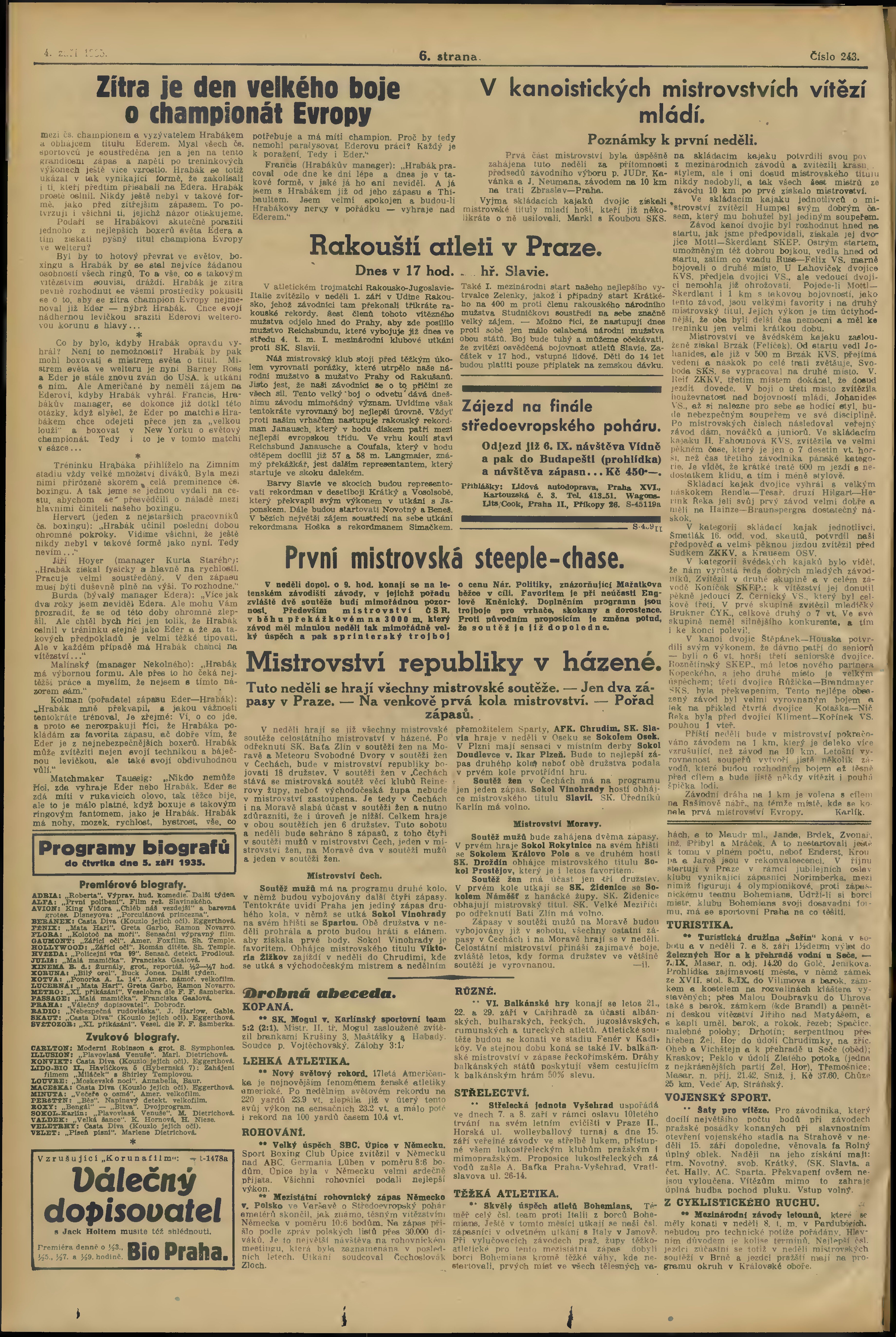 * Datum vydání výtisku: 4.9.1935 Číslo výtisku: 243 Poznámky k výtisku: večerní vydání;