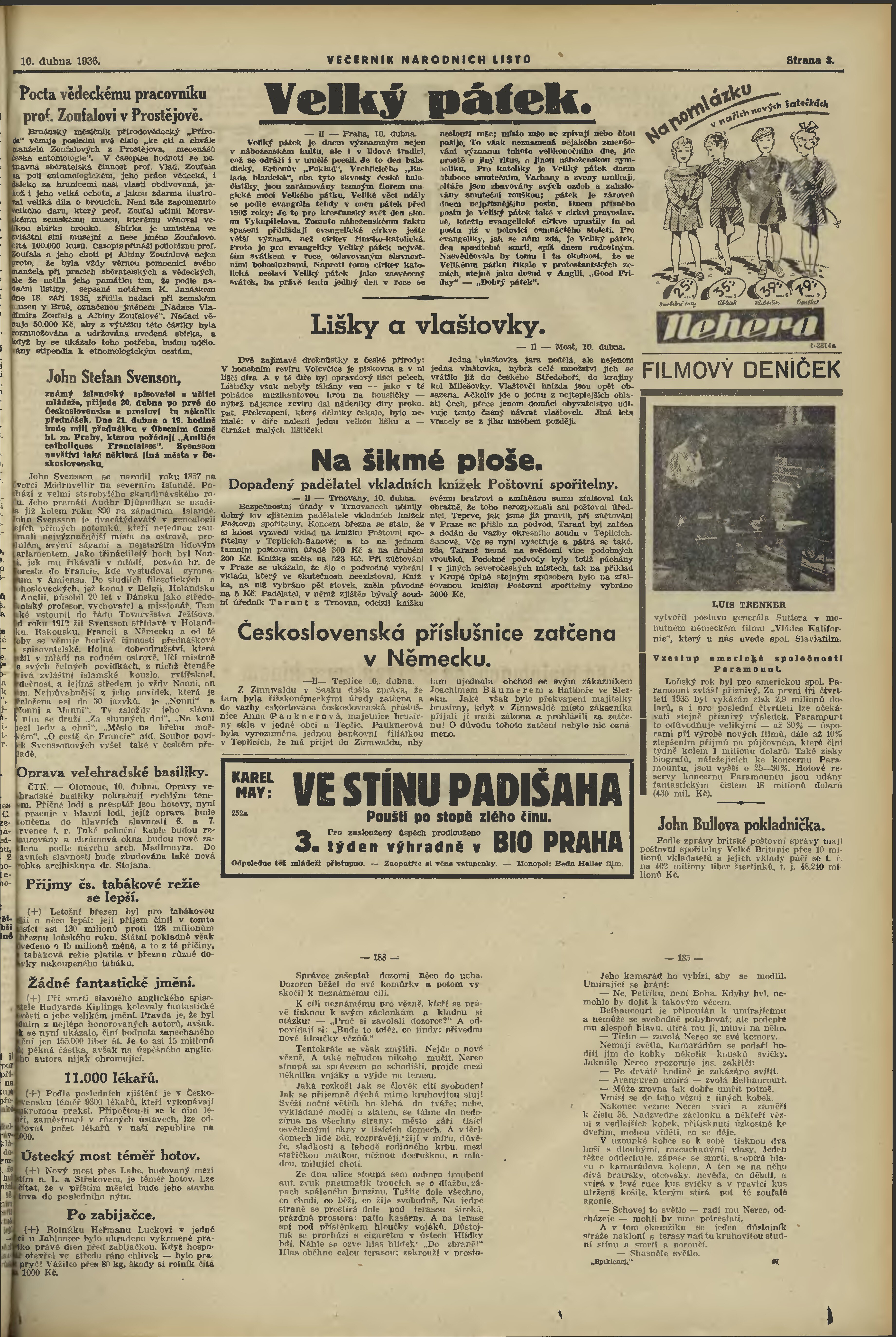 * Datum vydání výtisku: 10.4.1936 Číslo výtisku: 100 Poznámky k výtisku: večerní vydání;