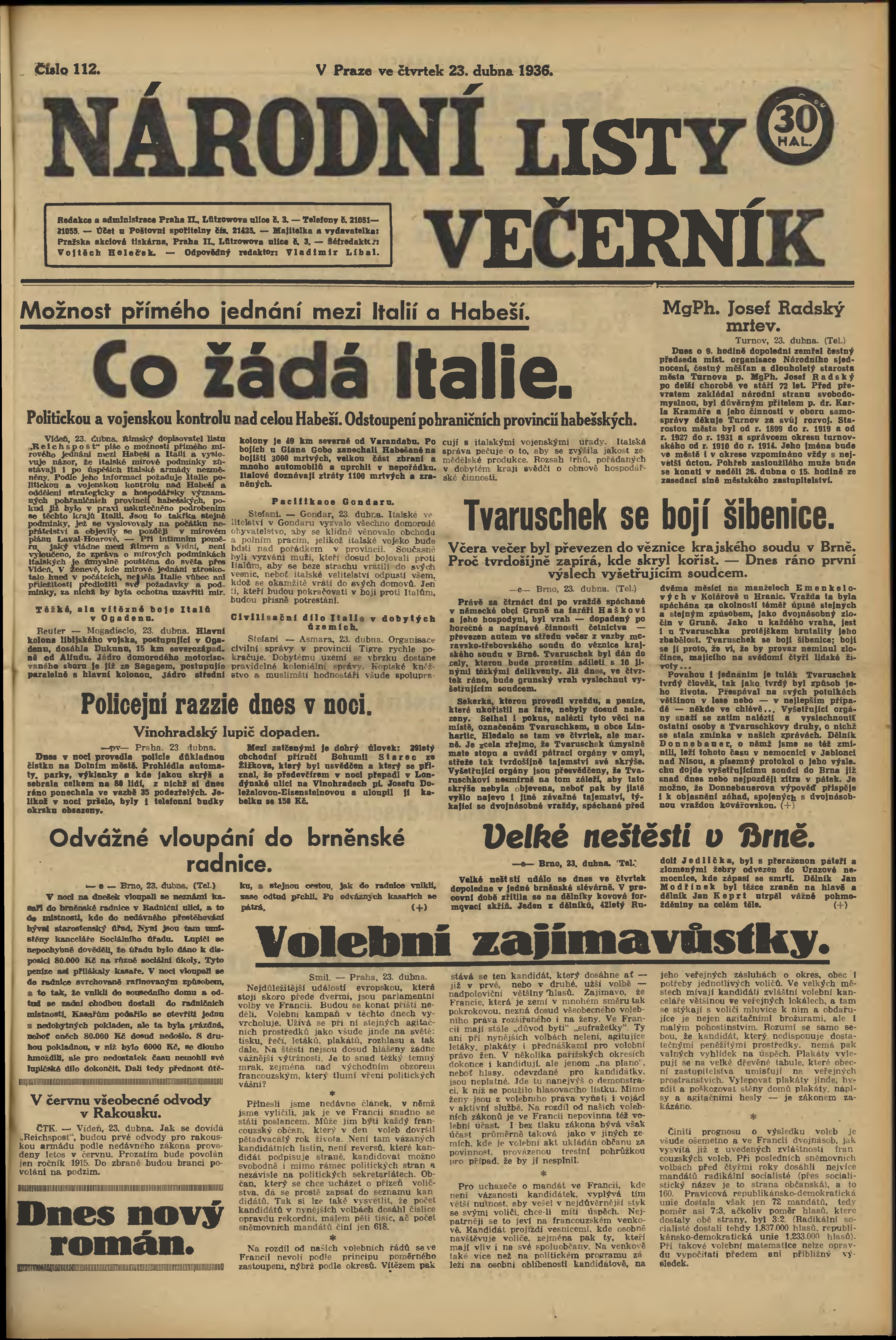 * Datum vydání výtisku: 23.4.1936 Číslo výtisku: 112 Poznámky k výtisku: večerní vydání;