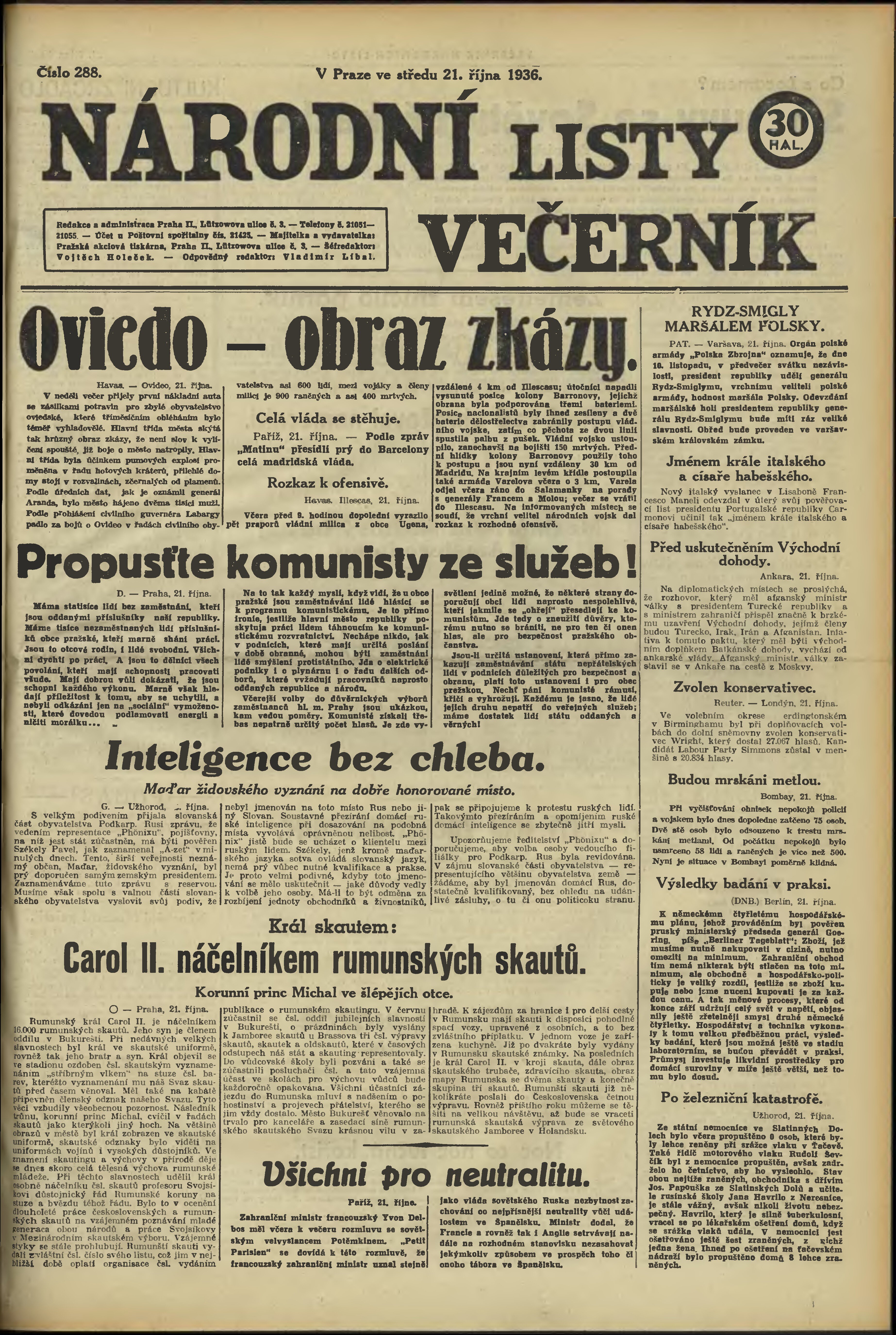 * Datum vydání výtisku: 21.10.1936 Číslo výtisku: 288 Poznámky k výtisku: večerní vydání;