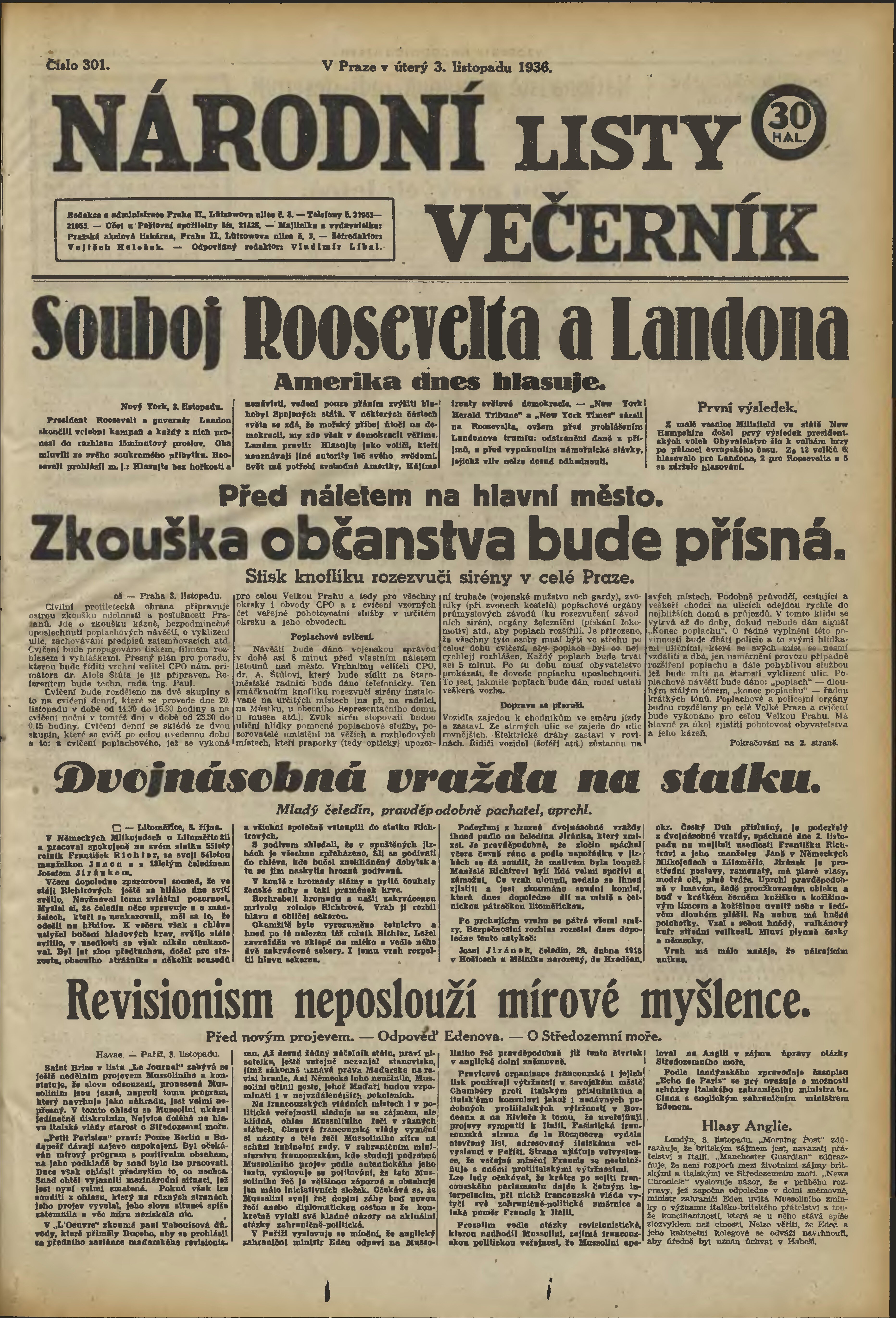 * Datum vydání výtisku: 3.11.1936 Číslo výtisku: 301 Poznámky k výtisku: večerní vydání;