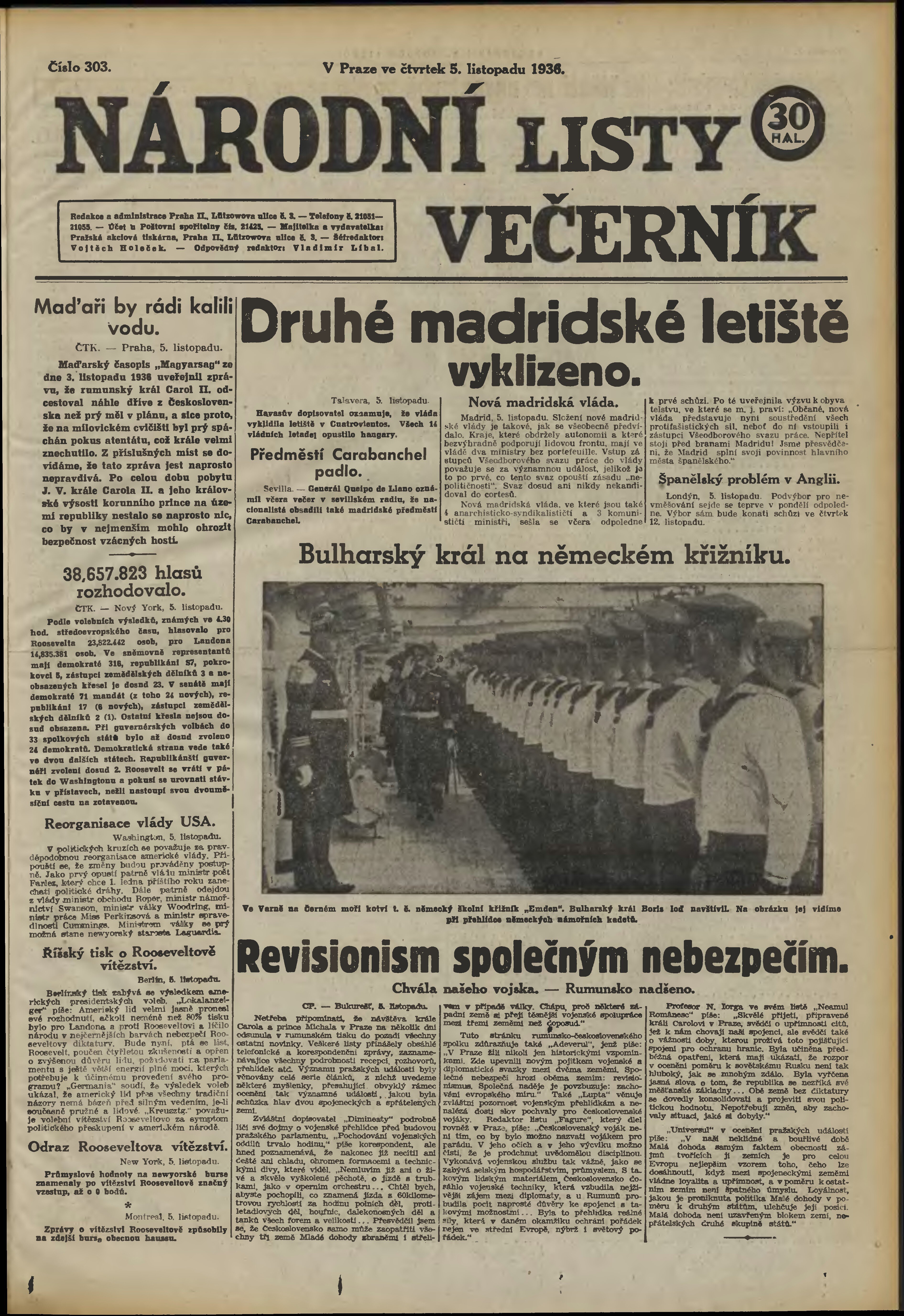 * Datum vydání výtisku: 5.11.1936 Číslo výtisku: 303 Poznámky k výtisku: večerní vydání;