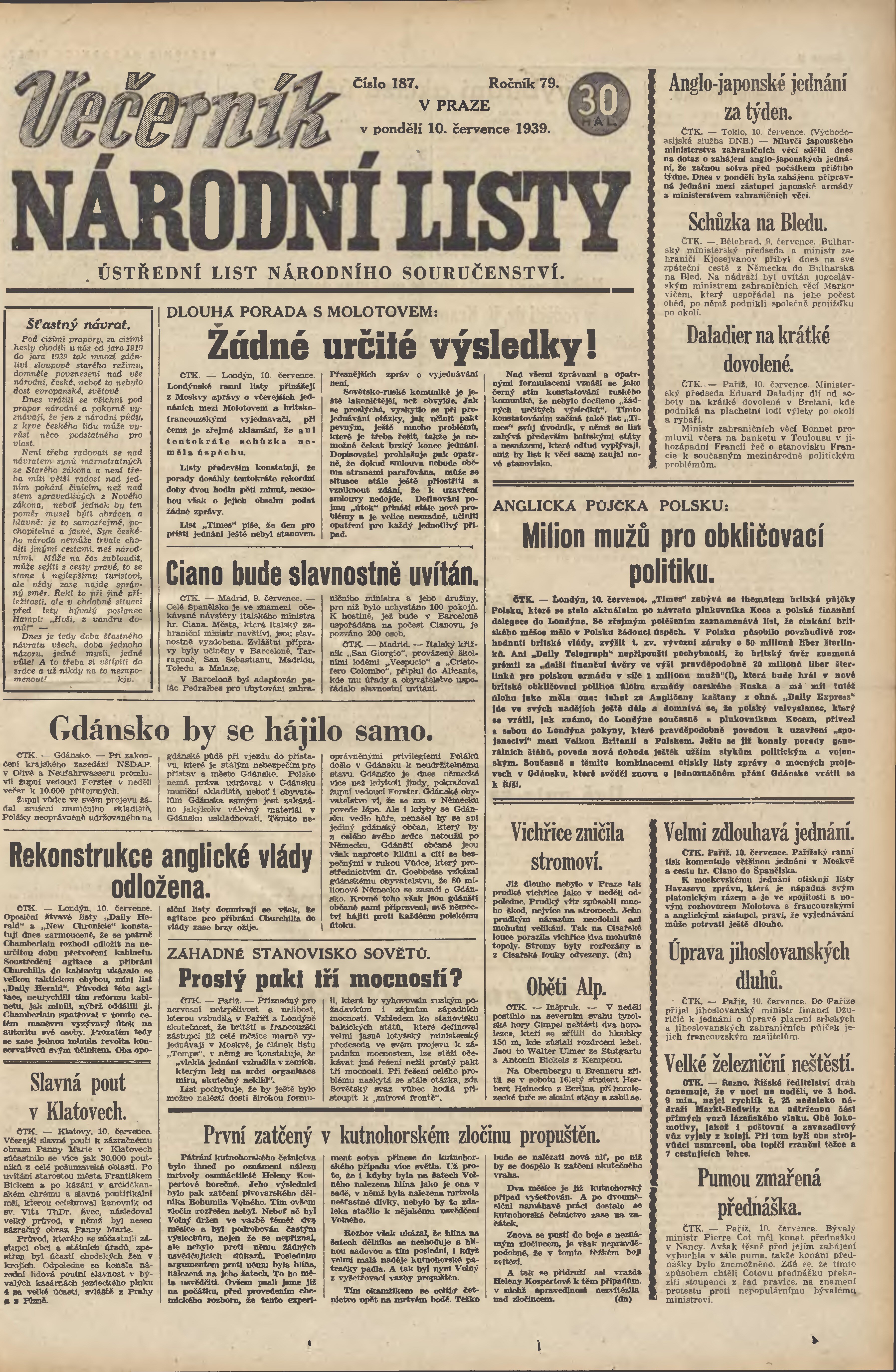* Datum vydání výtisku: 10.7.1939 Číslo výtisku: 187 Poznámky k výtisku: večerní vydání; 1. vydání;
