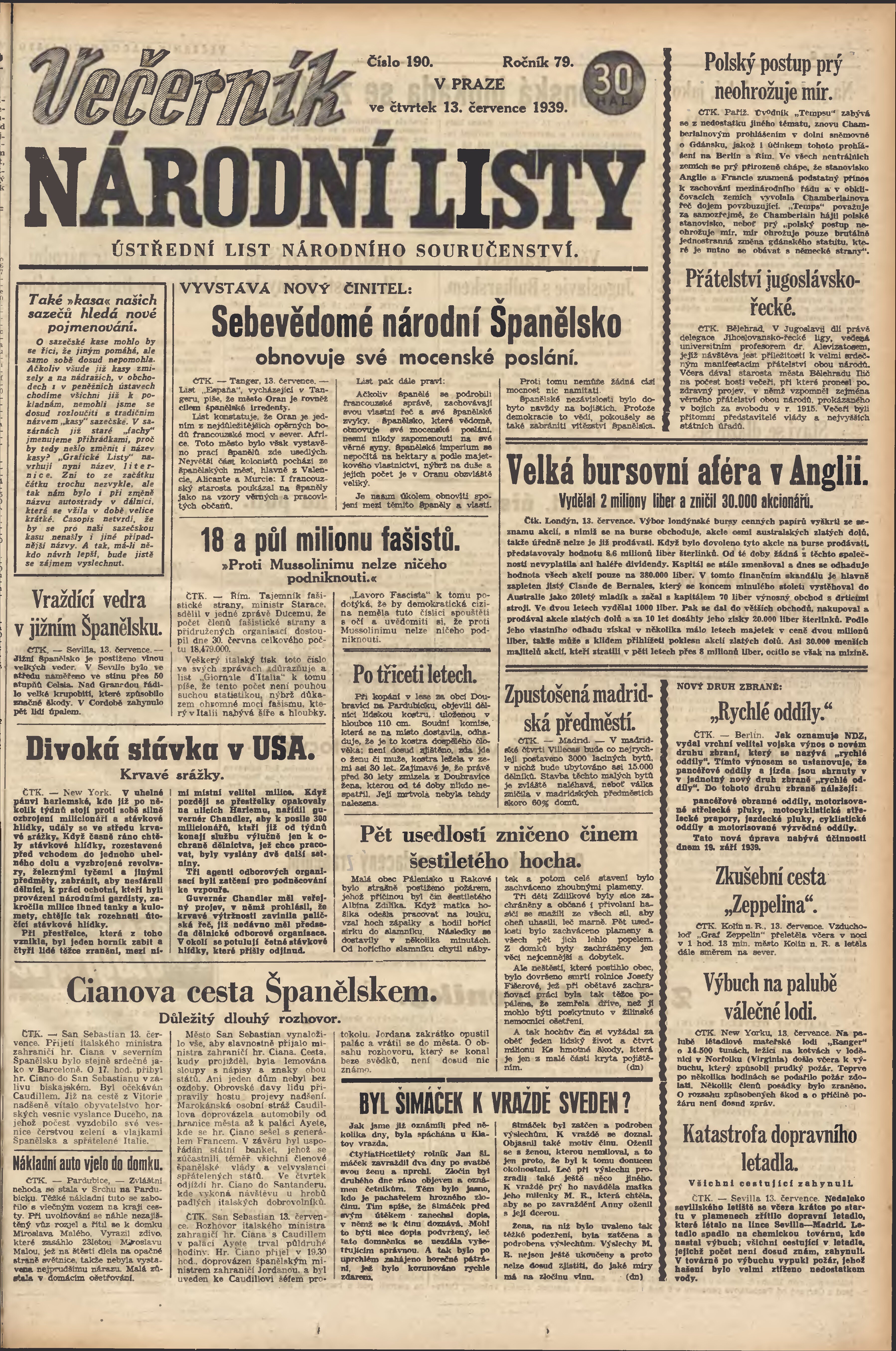 * Datum vydání výtisku: 13.7.1939 Číslo výtisku: 190 Poznámky k výtisku: večerní vydání; 2. vydání;