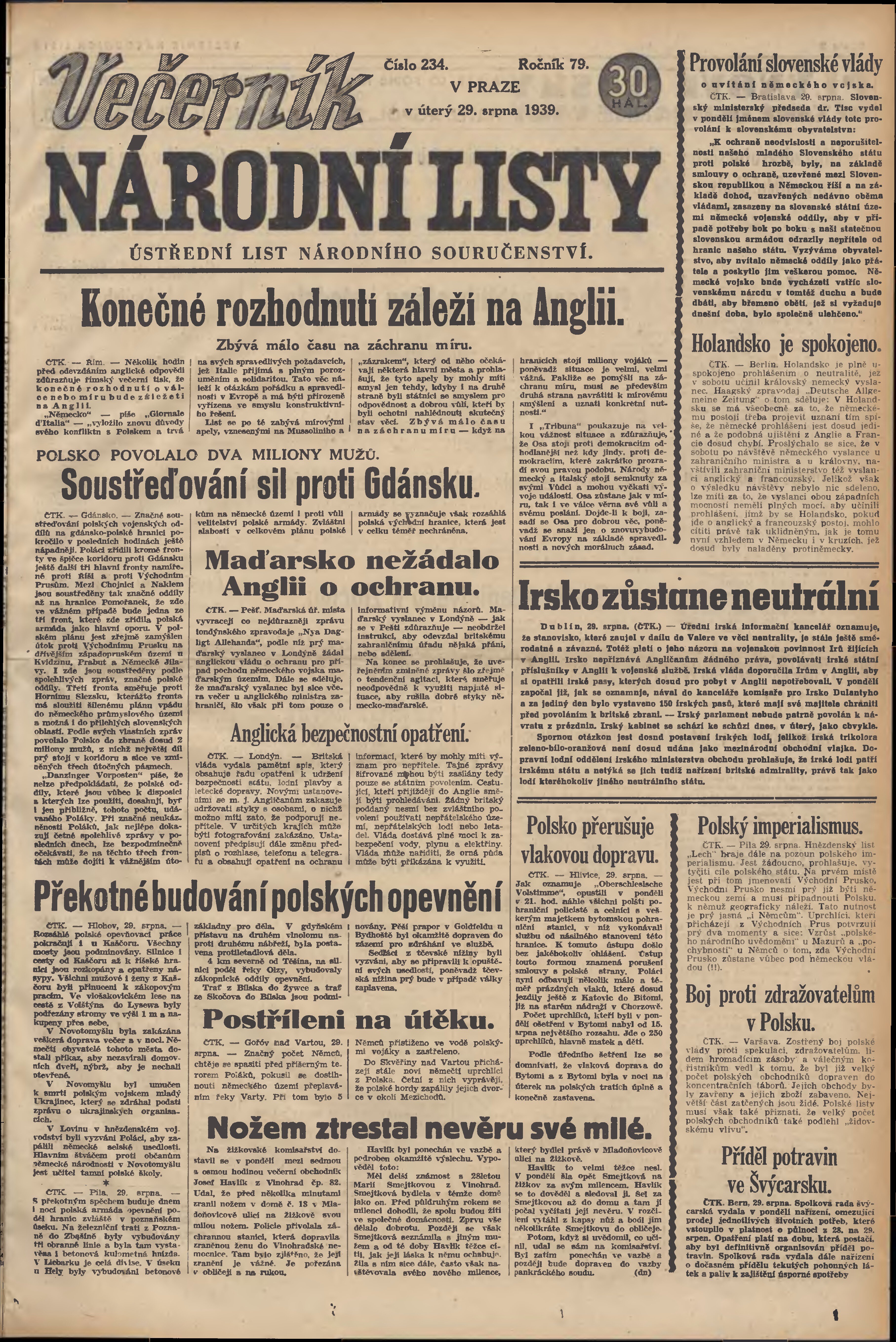 * Datum vydání výtisku: 29.8.1939 Číslo výtisku: 234 Poznámky k výtisku: večerní vydání; 2. vydání;