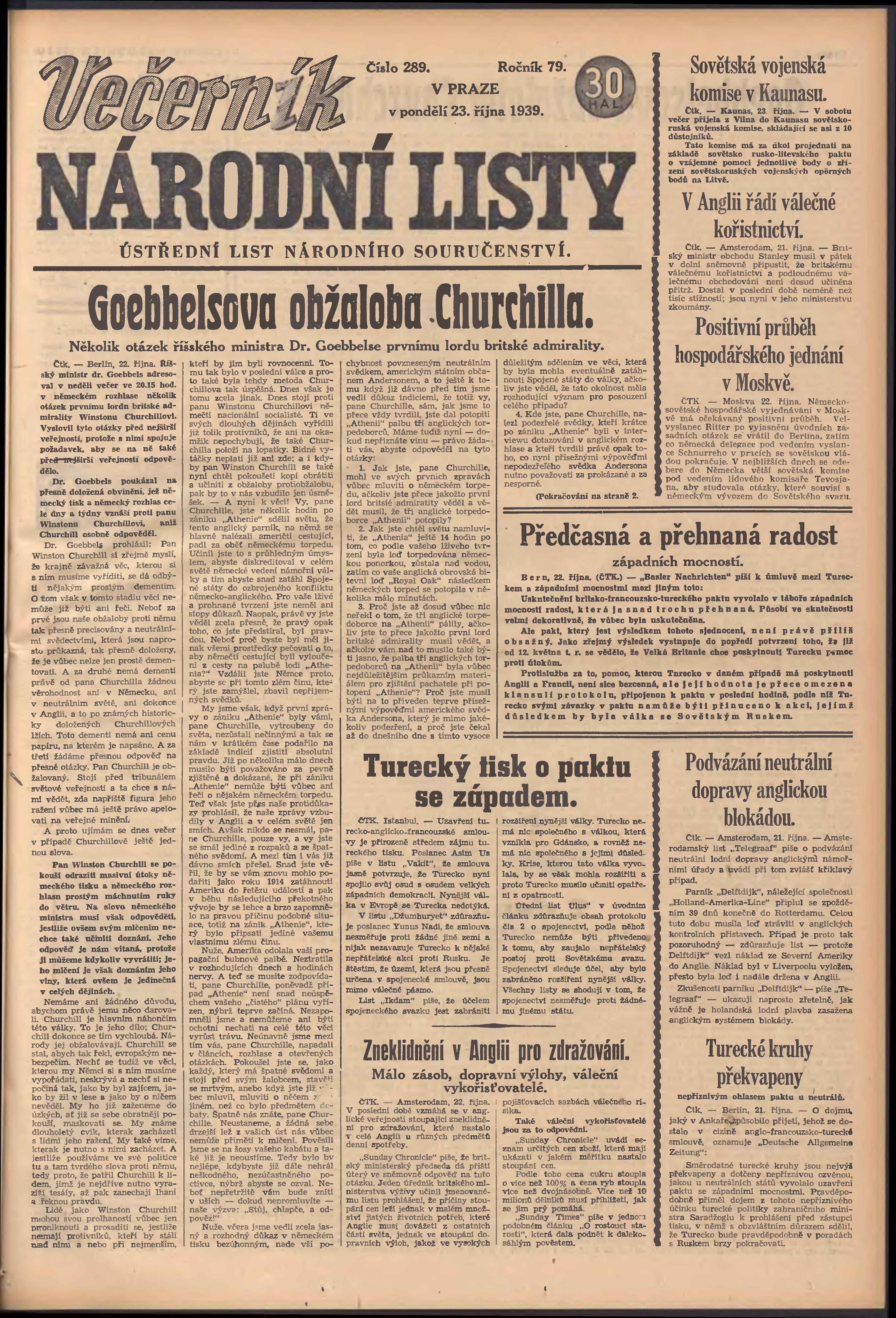 * Datum vydání výtisku: 23.10.1939 Číslo výtisku: 289 Poznámky k výtisku: večerní vydání; 2. vydání;