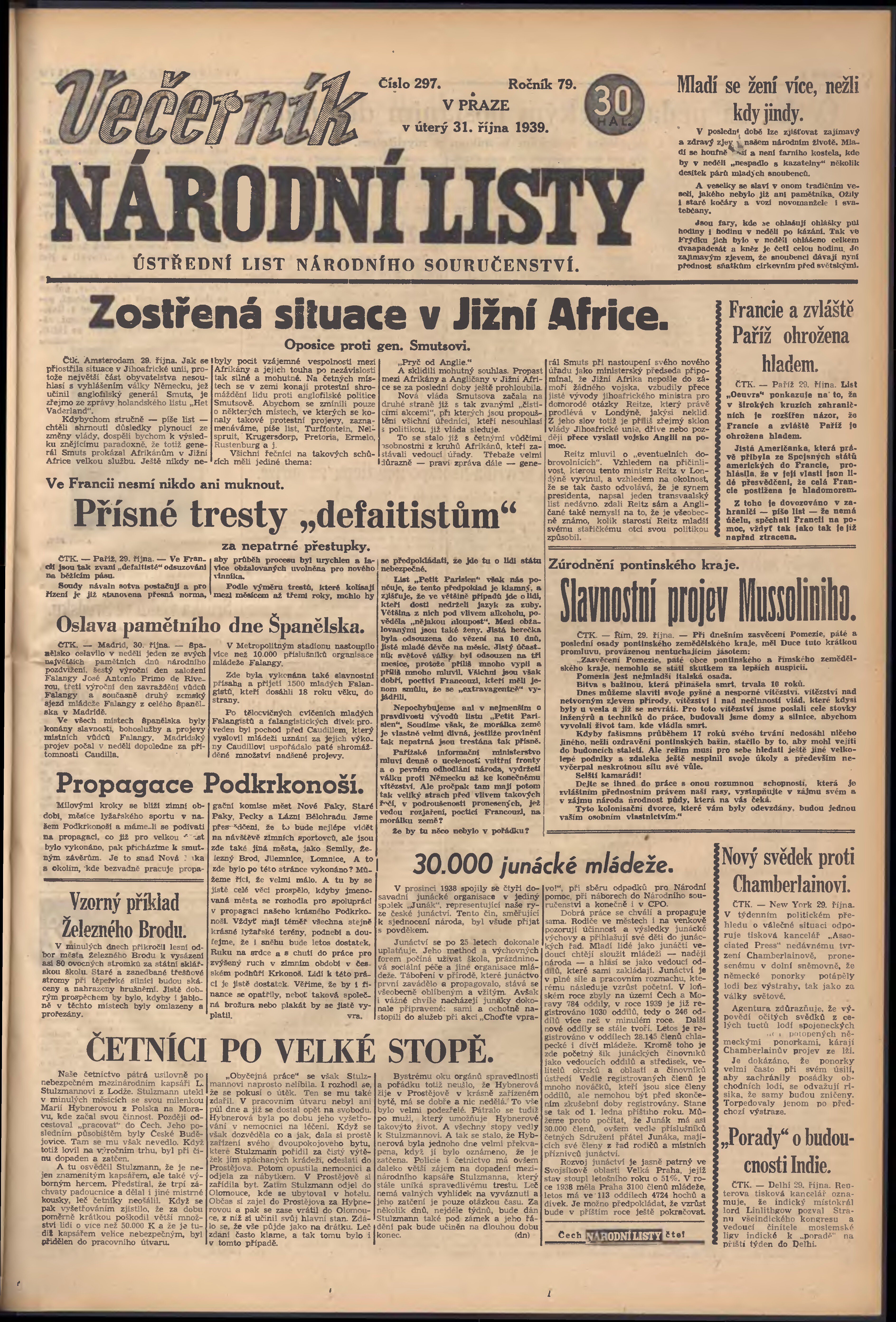 * Datum vydání výtisku: 31.10.1939 Číslo výtisku: 297 Poznámky k výtisku: večerní vydání; 1. vydání;