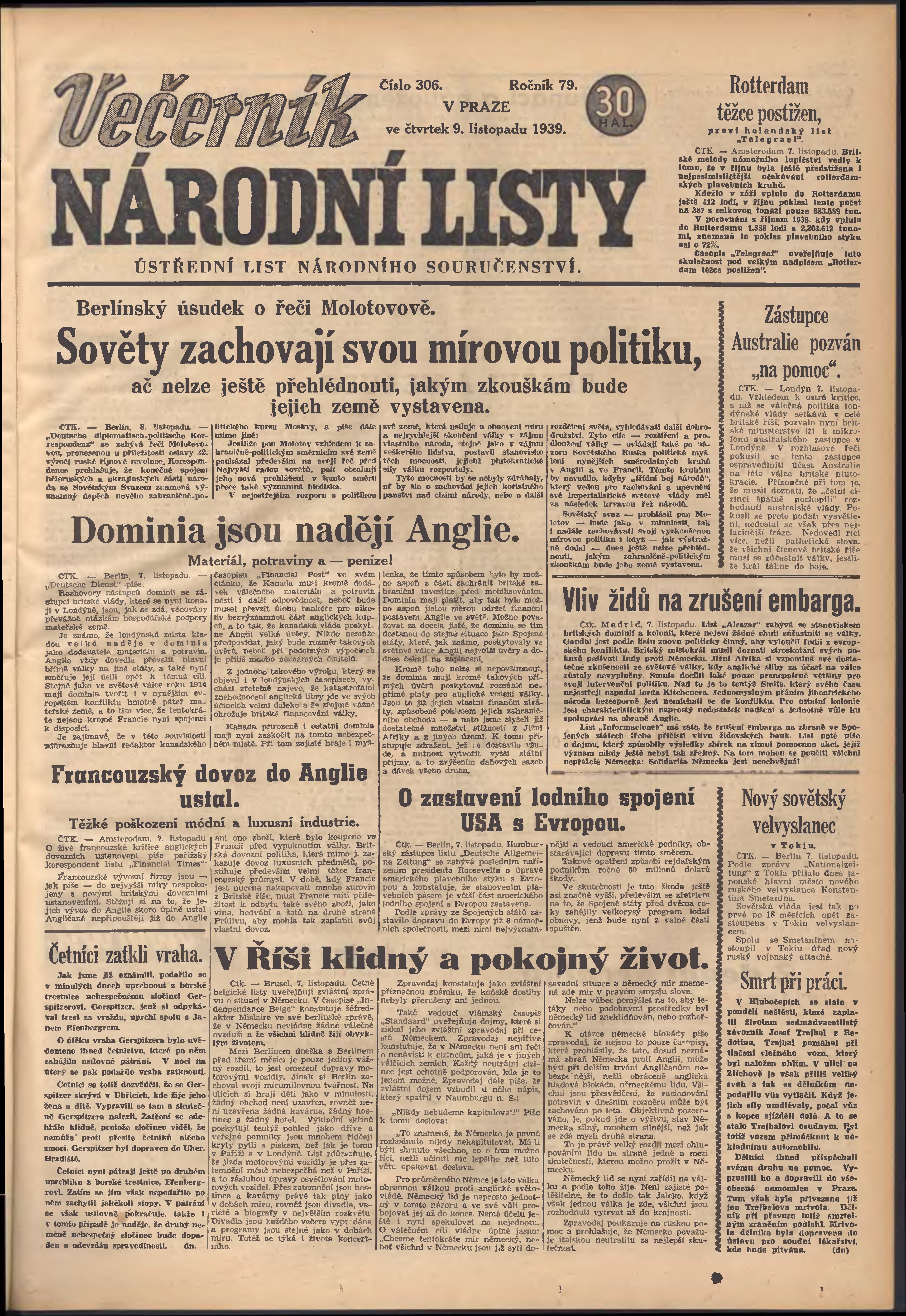 * Datum vydání výtisku: 9.11.1939 Číslo výtisku: 306 Poznámky k výtisku: večerní vydání; 1. vydání;