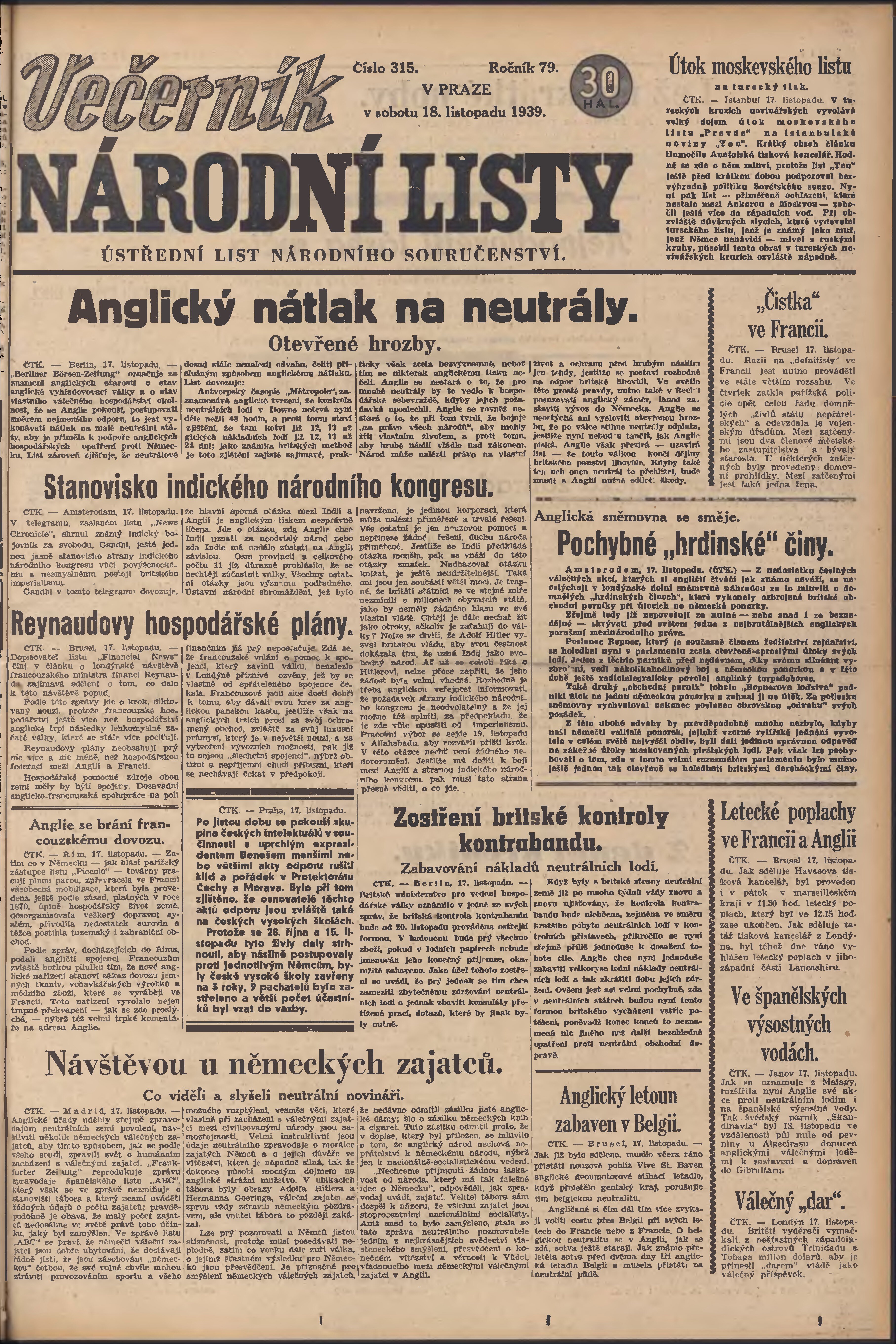 * Datum vydání výtisku: 18.11.1939 Číslo výtisku: 315 Poznámky k výtisku: večerní vydání; 2. vydání;