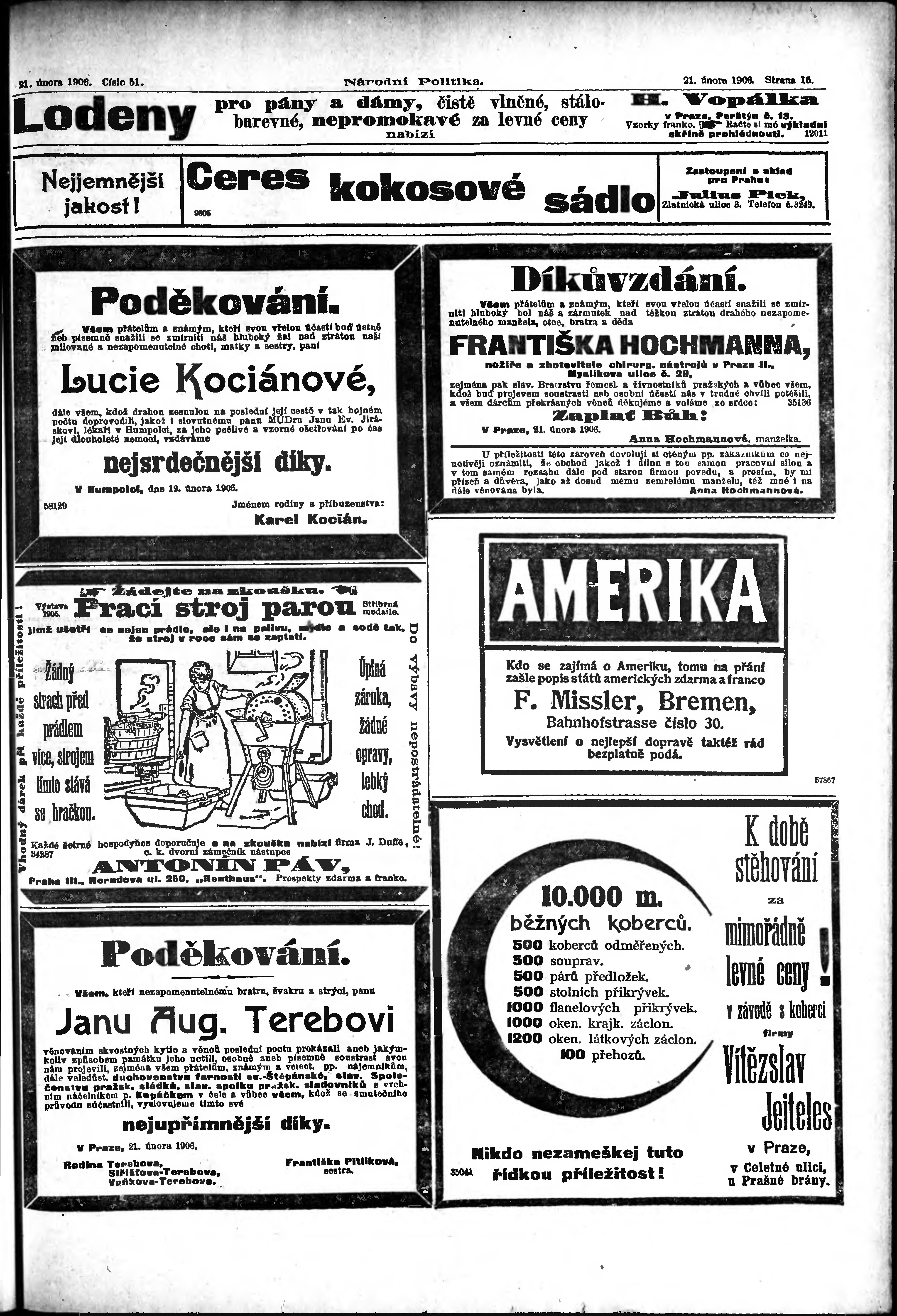 * Datum vydání výtisku: 21.2.1906 Číslo výtisku: 51 Poznámky k výtisku: ranní vydání;