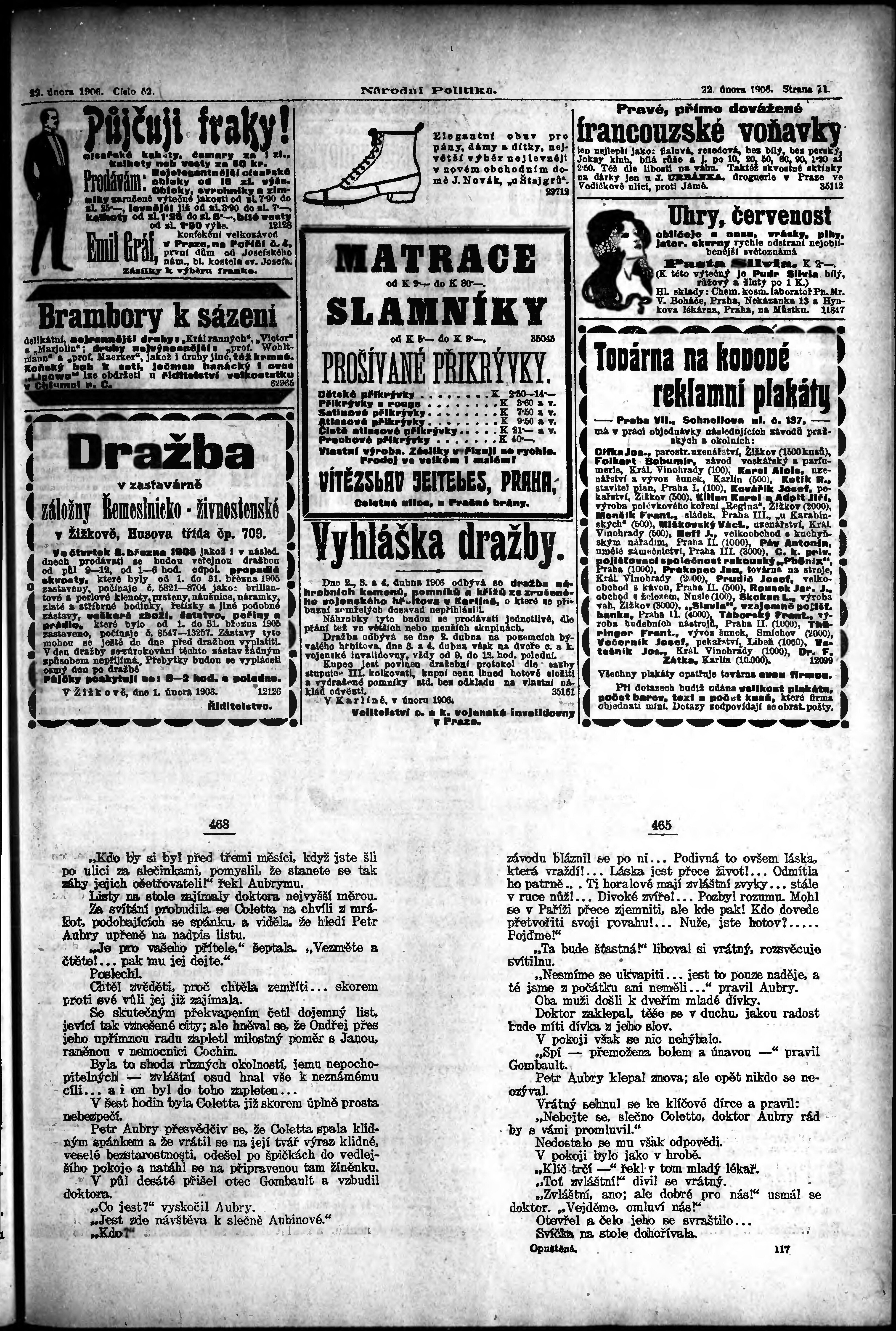 * Datum vydání výtisku: 22.2.1906 Číslo výtisku: 52 Poznámky k výtisku: ranní vydání;