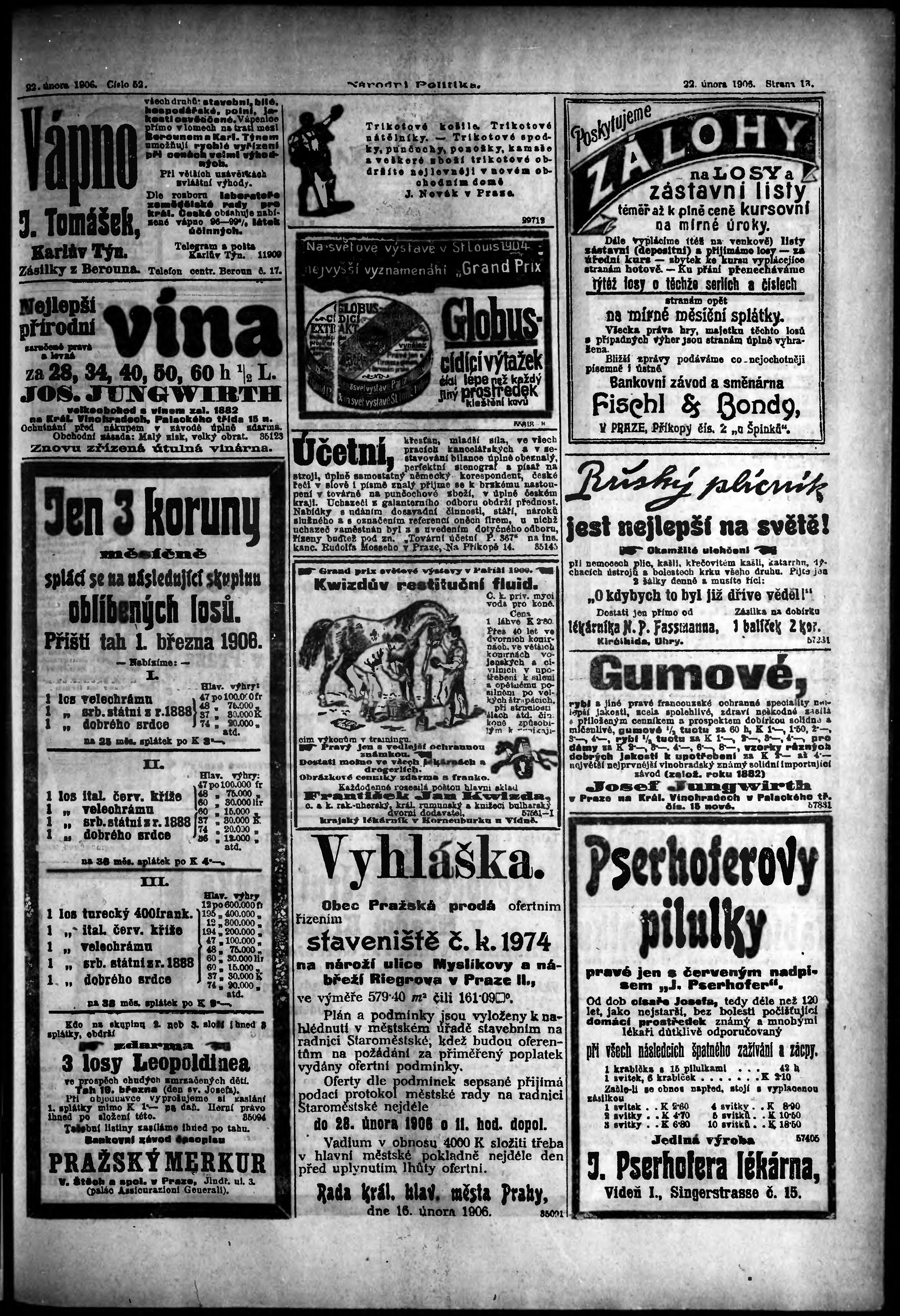 * Datum vydání výtisku: 22.2.1906 Číslo výtisku: 52 Poznámky k výtisku: ranní vydání;