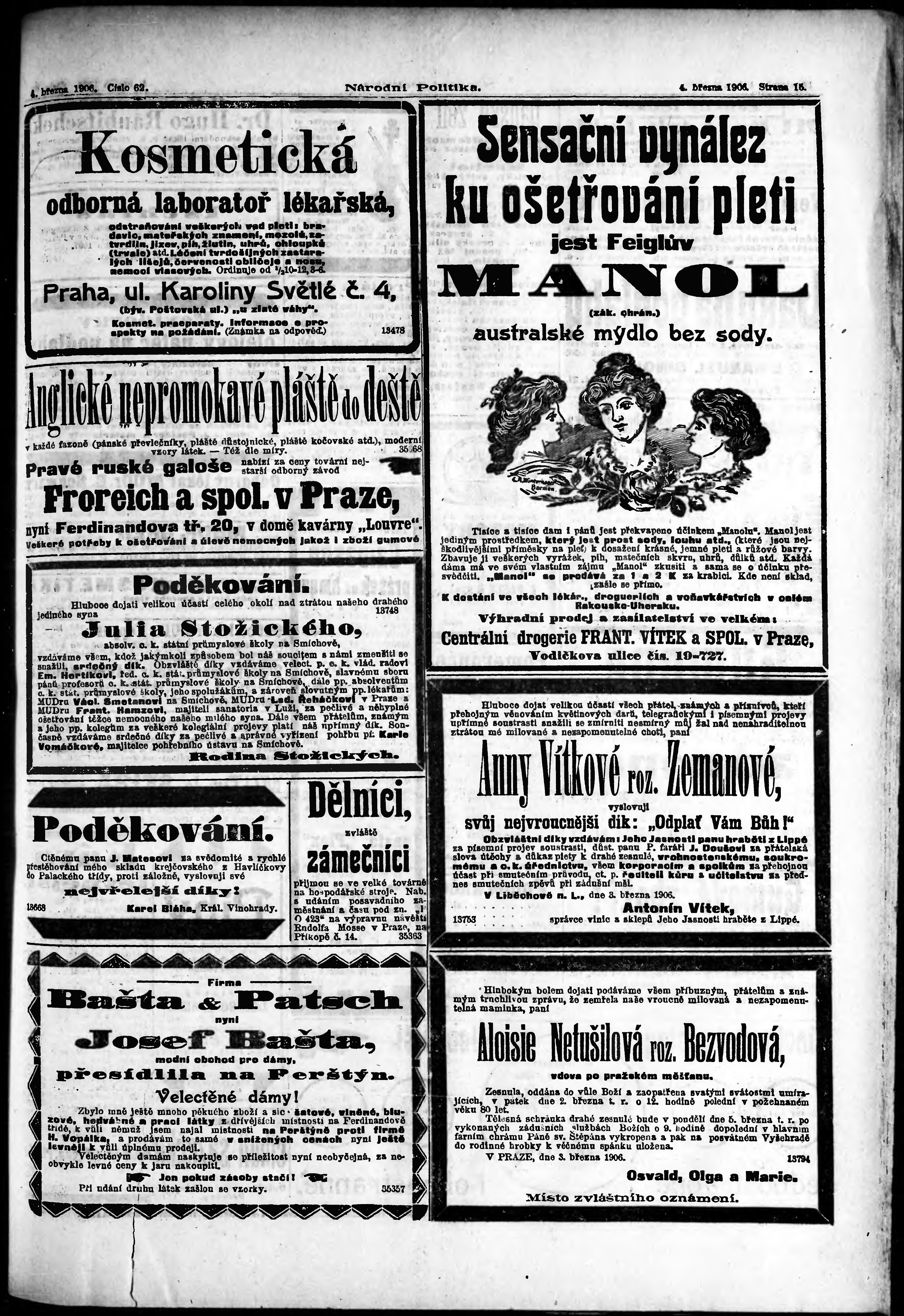 * Datum vydání výtisku: 4.3.1906 Číslo výtisku: 62 Poznámky k výtisku: ranní vydání;