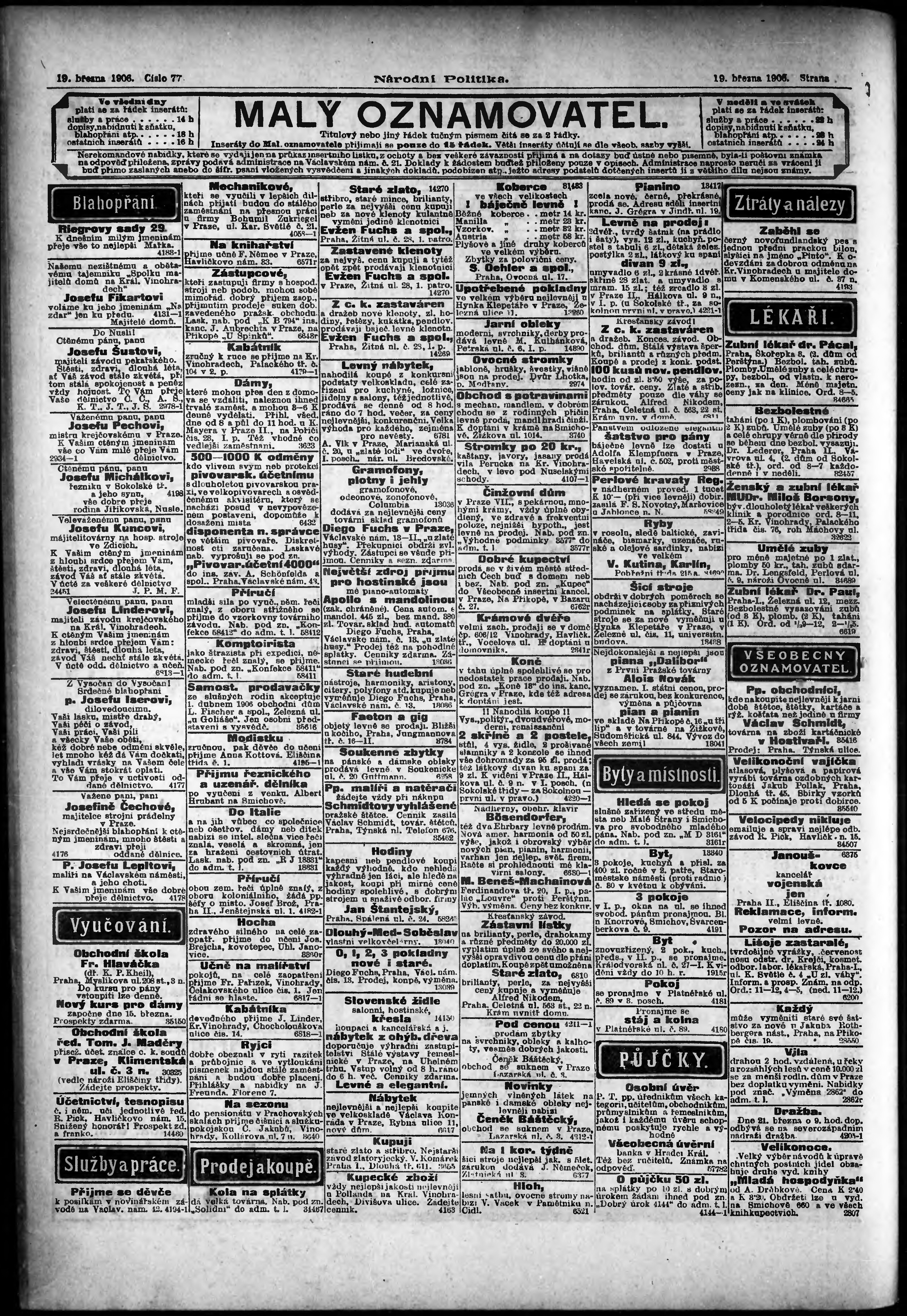 * Datum vydání výtisku: 19.3.1906 Číslo výtisku: 77 Poznámky k výtisku: ranní vydání;