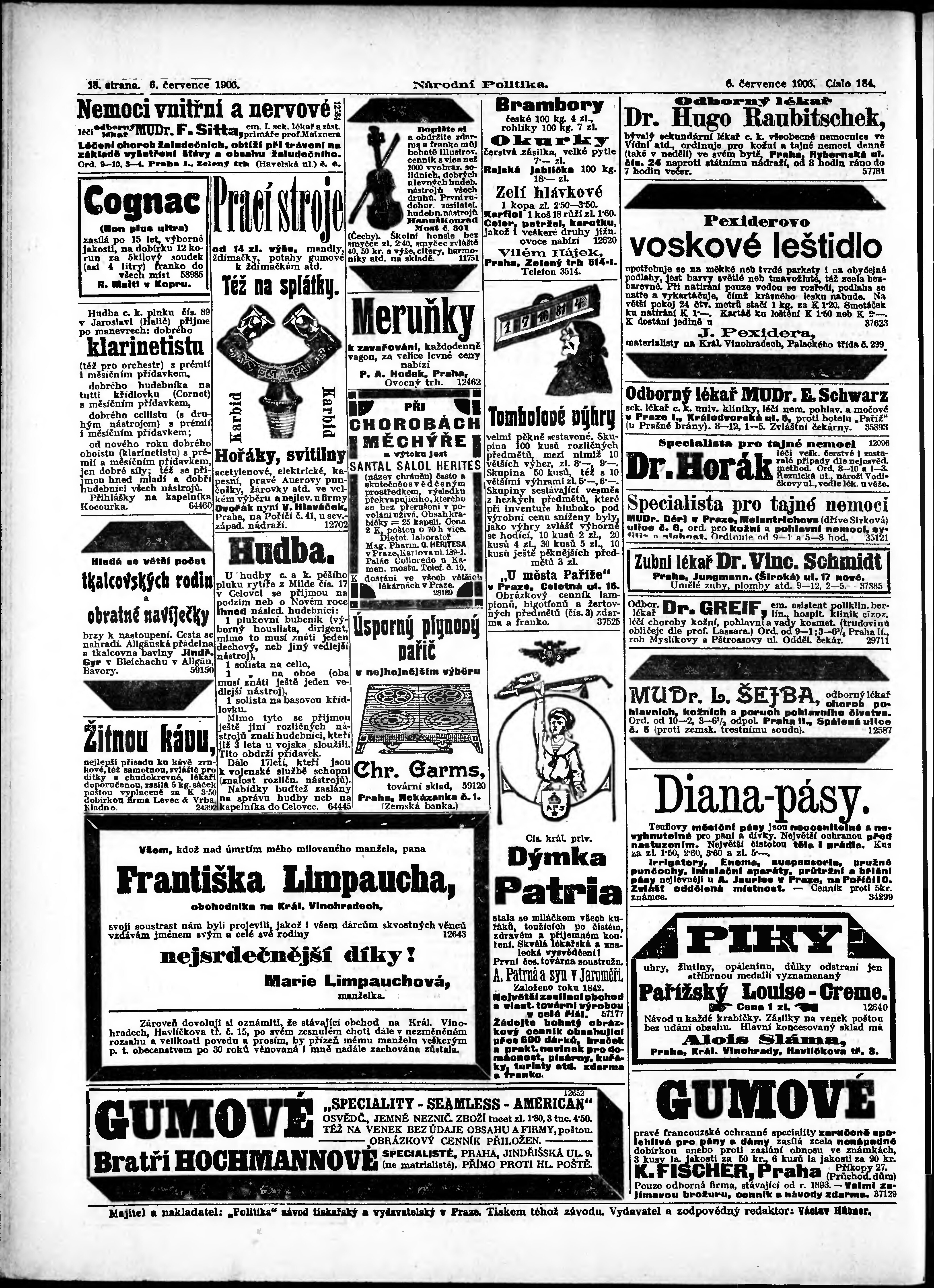 * Datum vydání výtisku: 6.7.1906 Číslo výtisku: 184 Poznámky k výtisku: ranní vydání;
