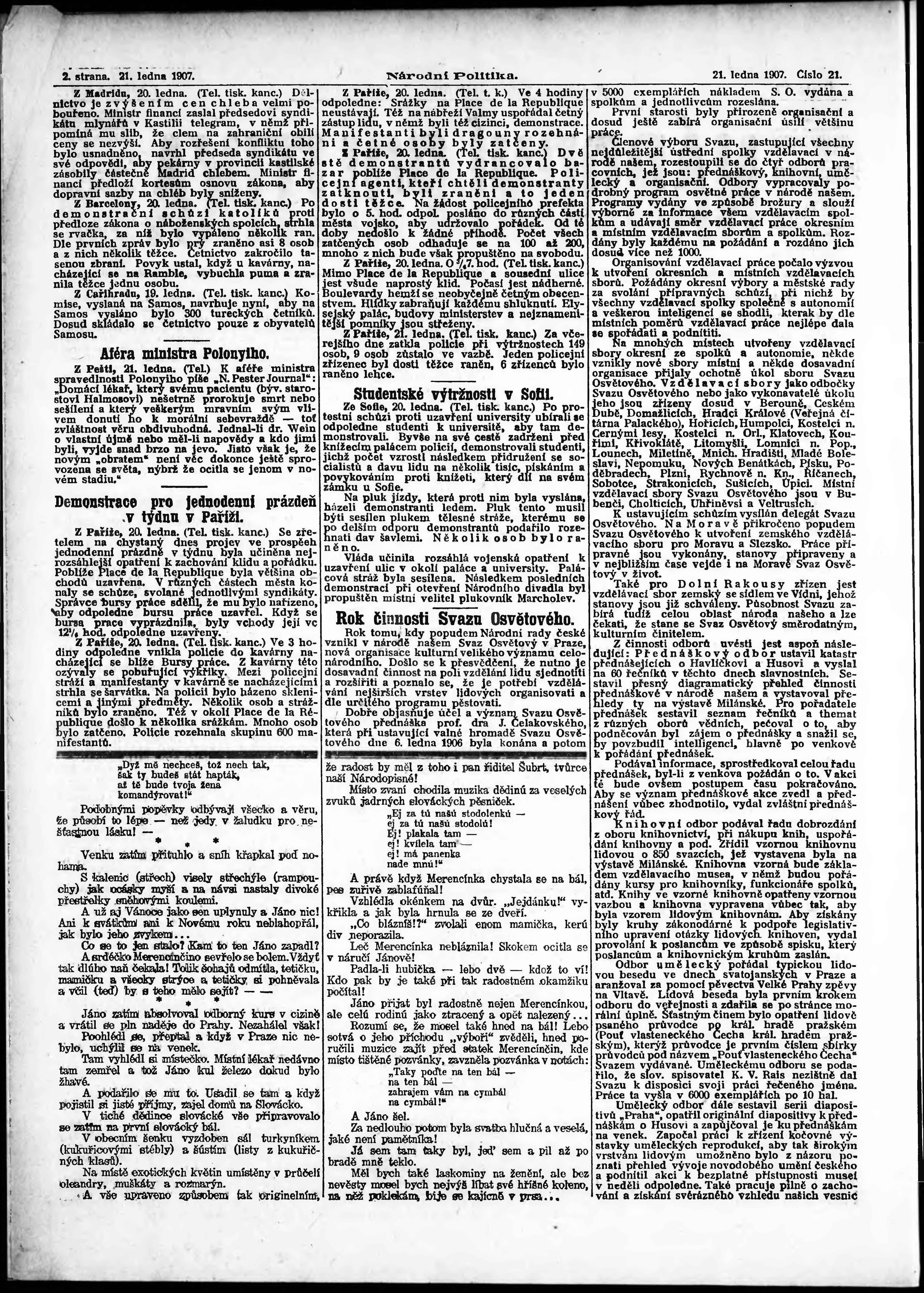 * Datum vydání výtisku: 21.1.1907 Číslo výtisku: 21 Poznámky k výtisku: ranní vydání;