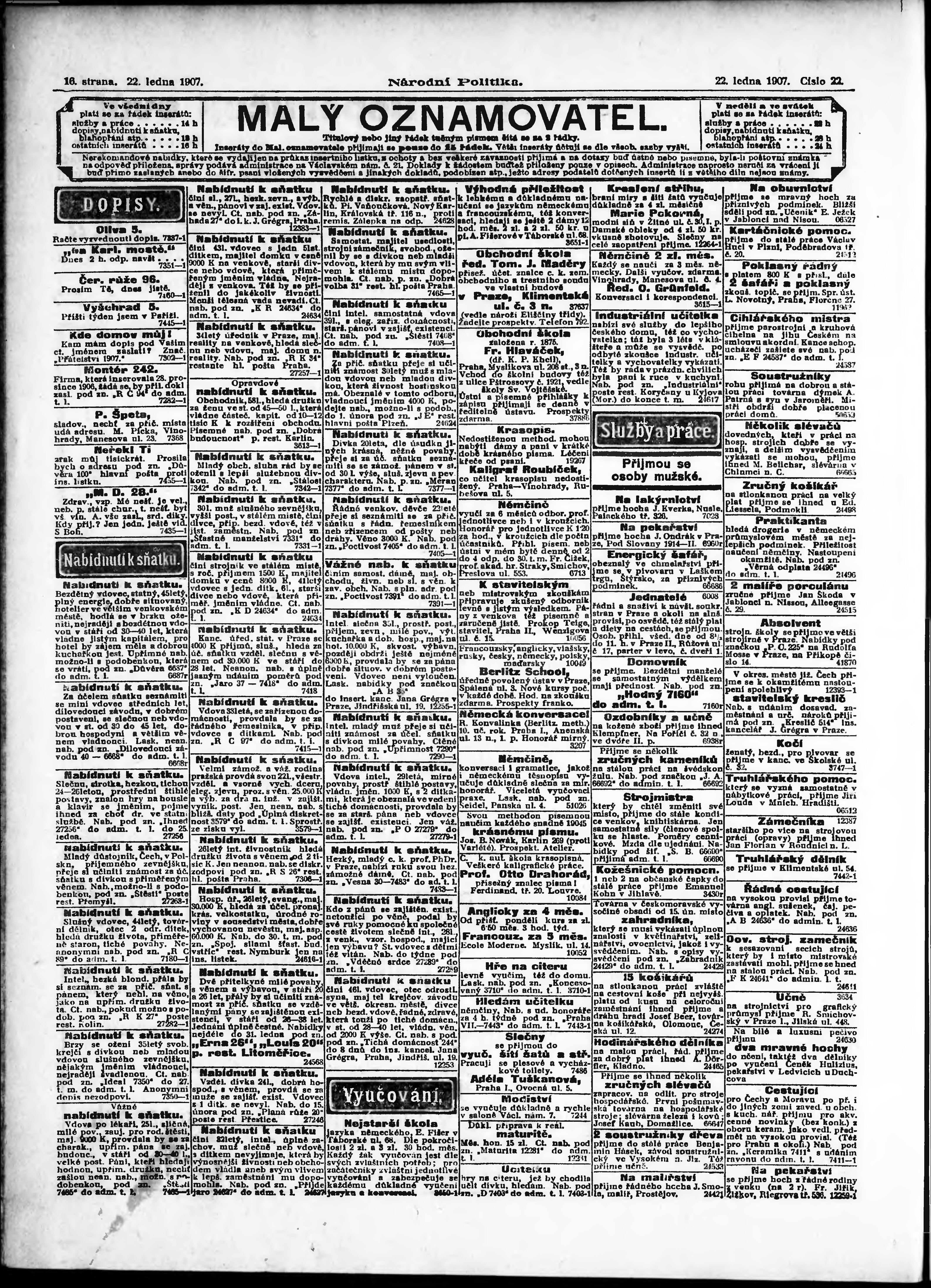 * Datum vydání výtisku: 22.1.1907 Číslo výtisku: 22 Poznámky k výtisku: ranní vydání;