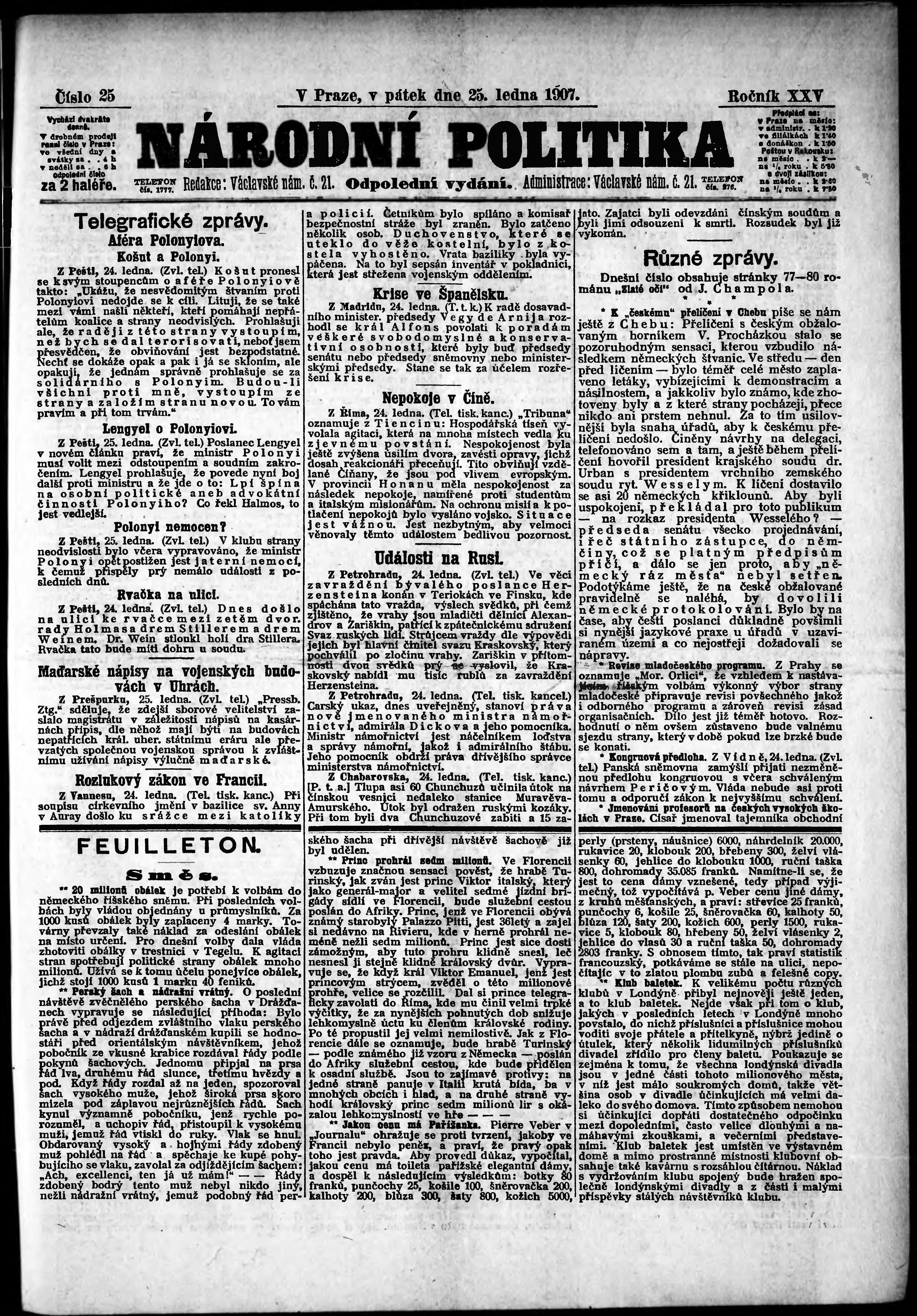 * Datum vydání výtisku: 25.1.1907 Číslo výtisku: 25 Poznámky k výtisku: odpolední vydání;