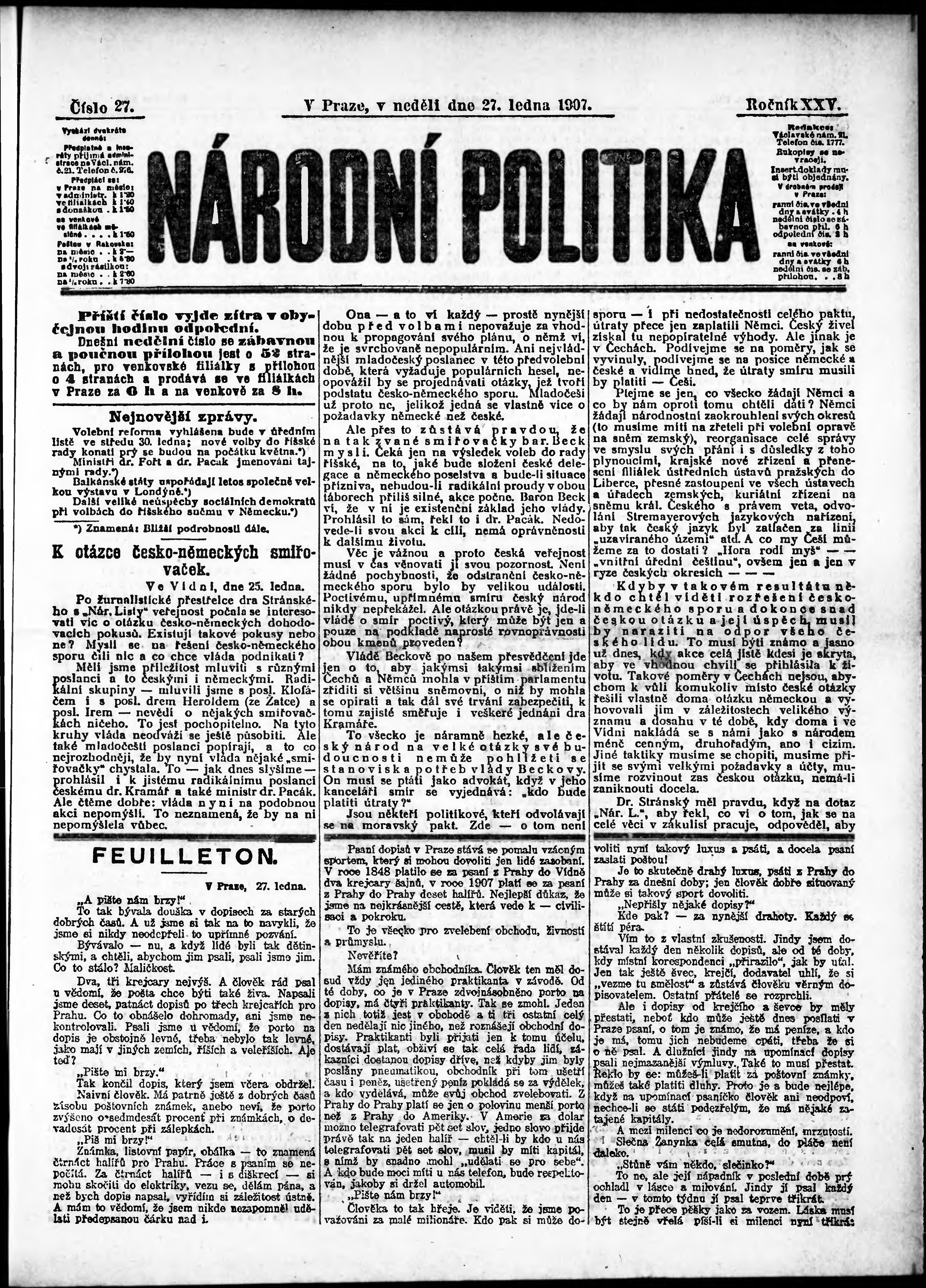 * Datum vydání výtisku: 27.1.1907 Číslo výtisku: 27 Poznámky k výtisku: ranní vydání;