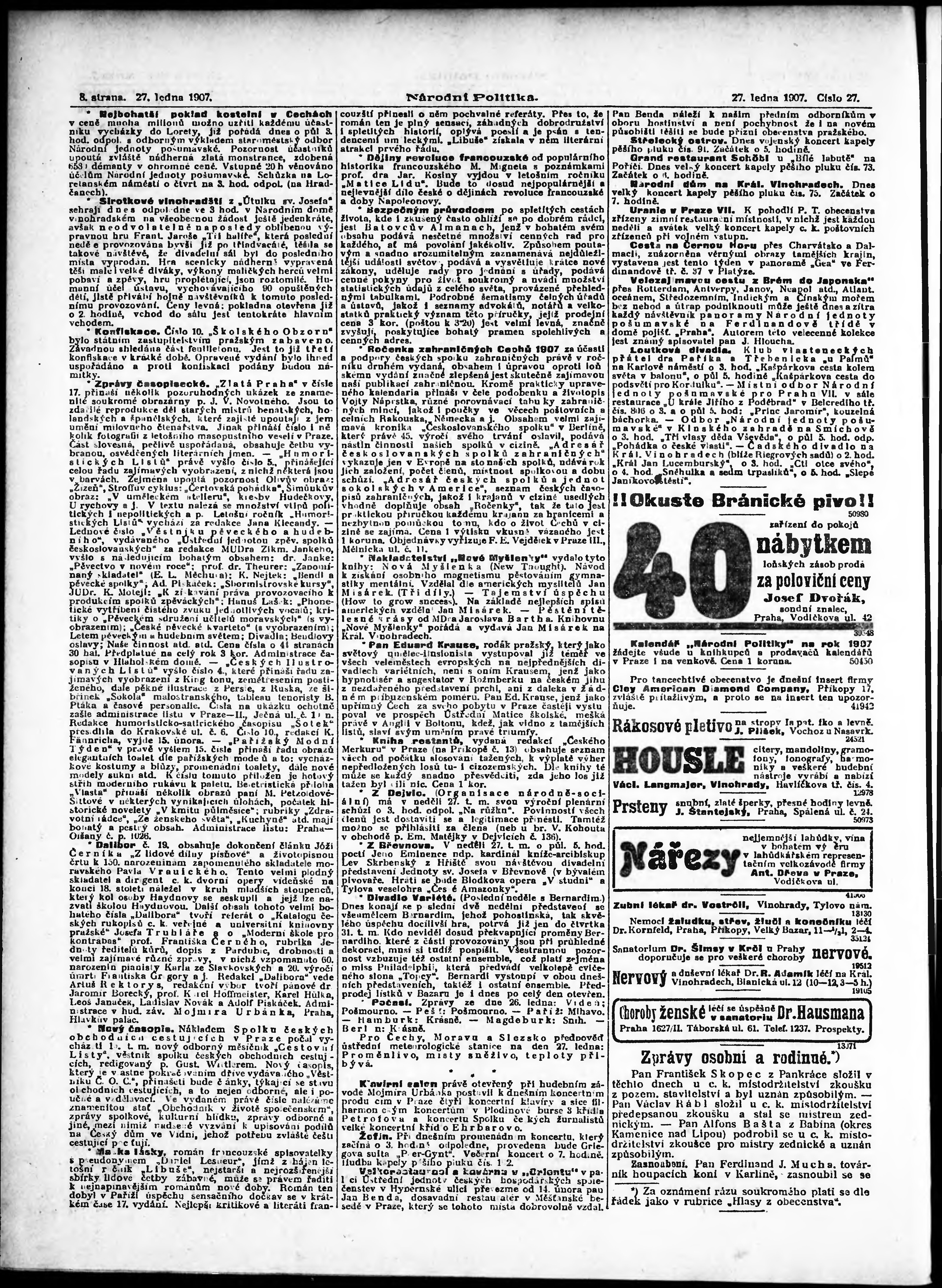 * Datum vydání výtisku: 27.1.1907 Číslo výtisku: 27 Poznámky k výtisku: ranní vydání;