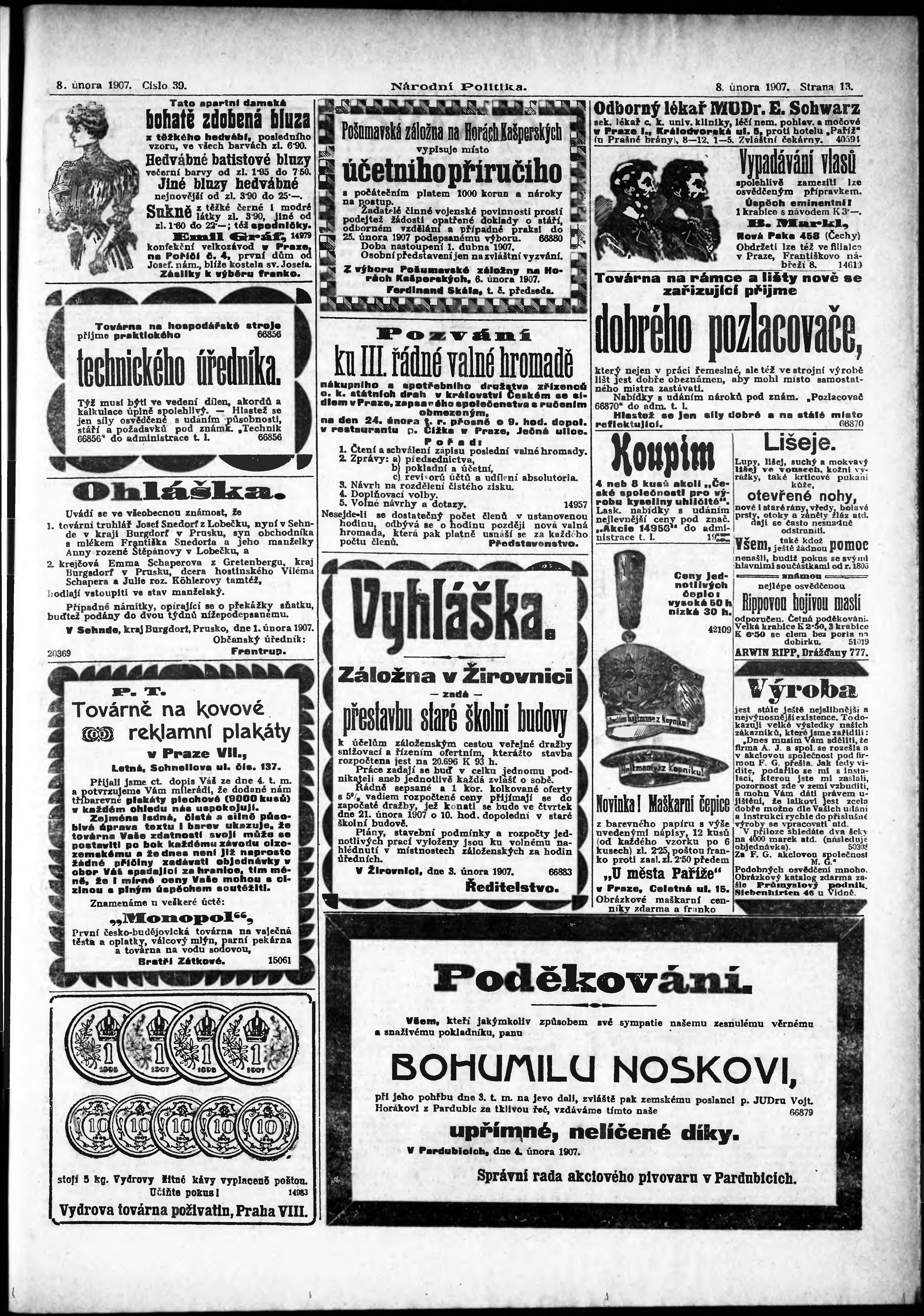 * Datum vydání výtisku: 8.2.1907 Číslo výtisku: 39 Poznámky k výtisku: ranní vydání;