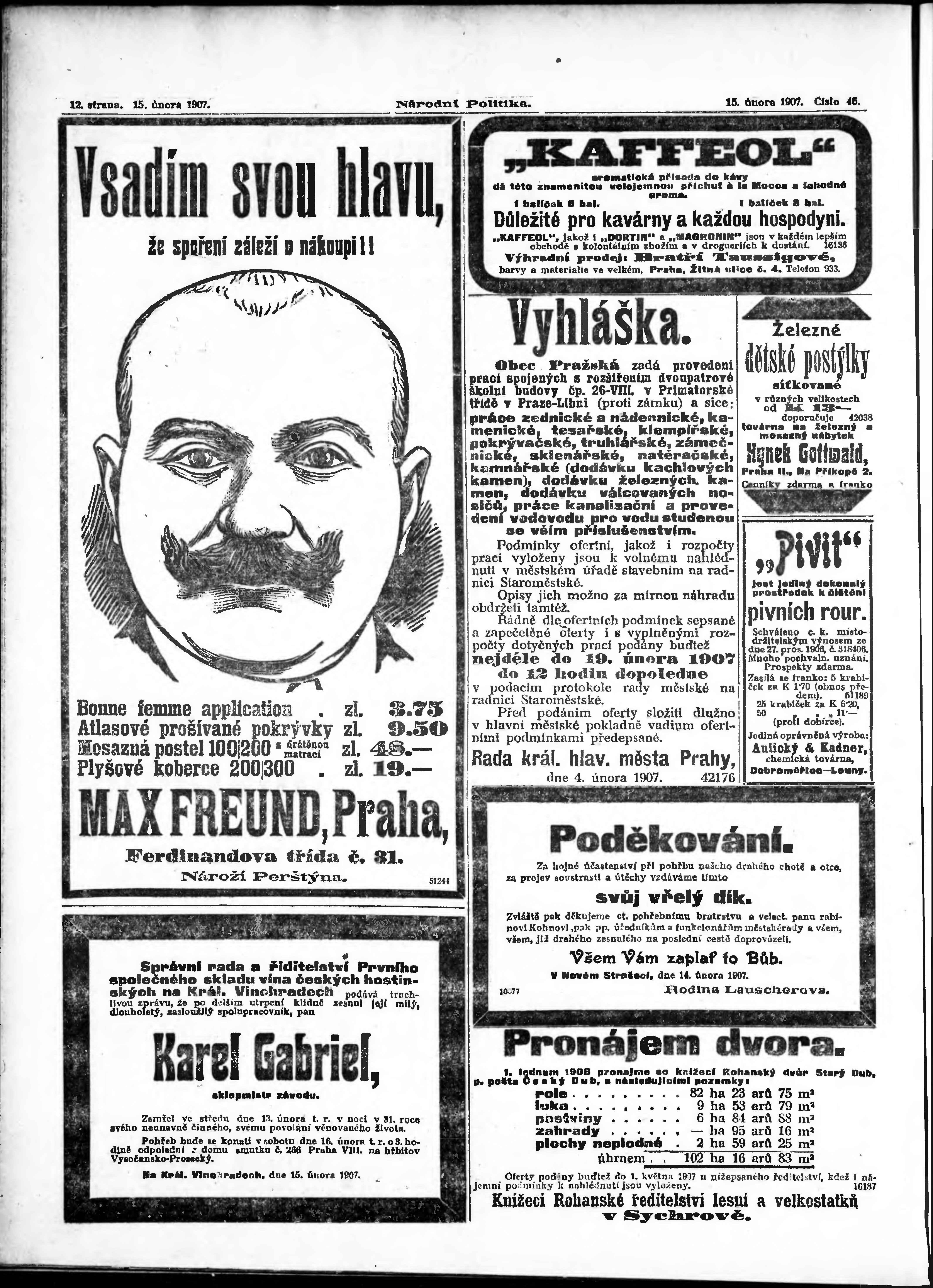 * Datum vydání výtisku: 15.2.1907 Číslo výtisku: 46 Poznámky k výtisku: ranní vydání;