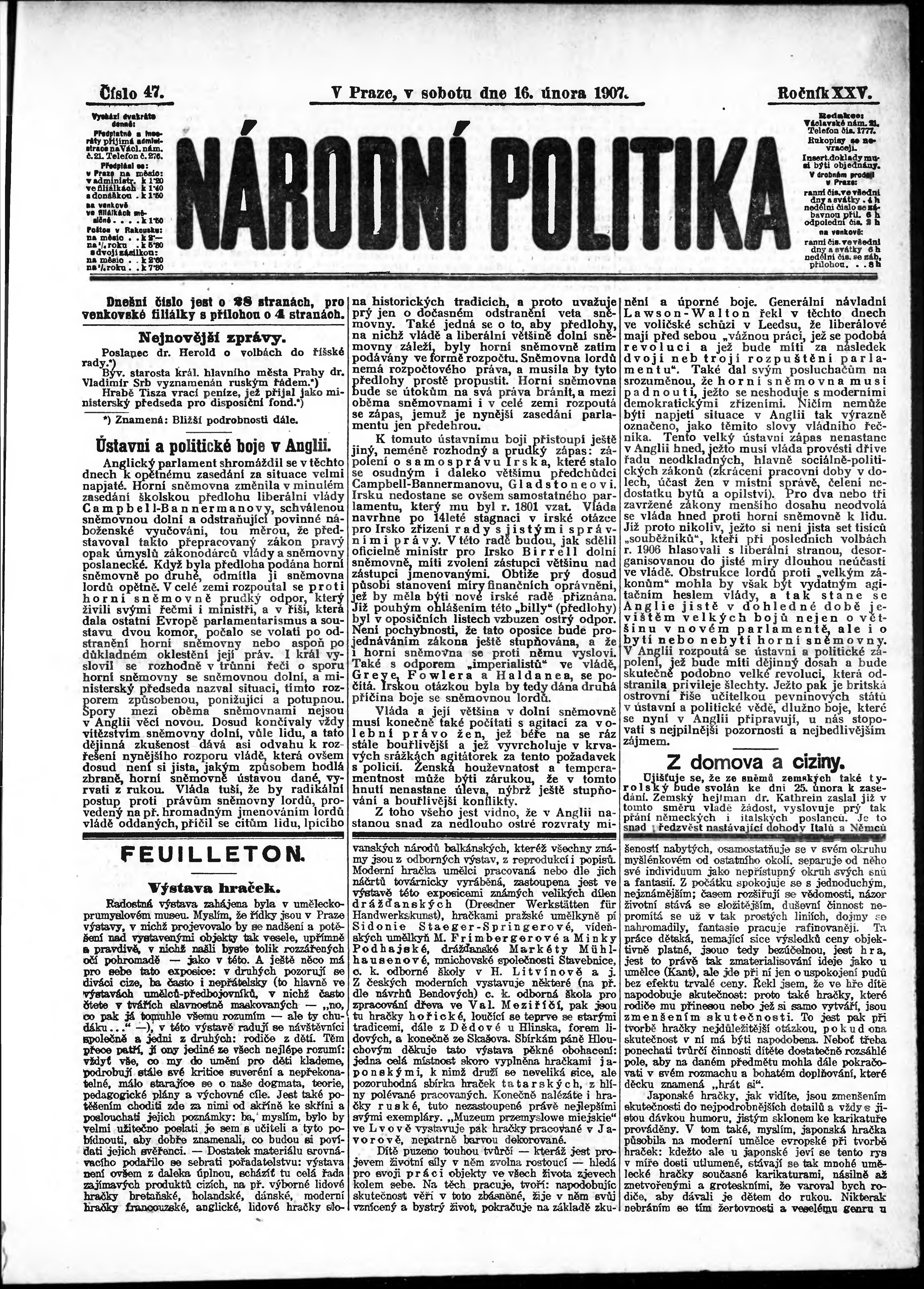 * Datum vydání výtisku: 16.2.1907 Číslo výtisku: 47 Poznámky k výtisku: ranní vydání;