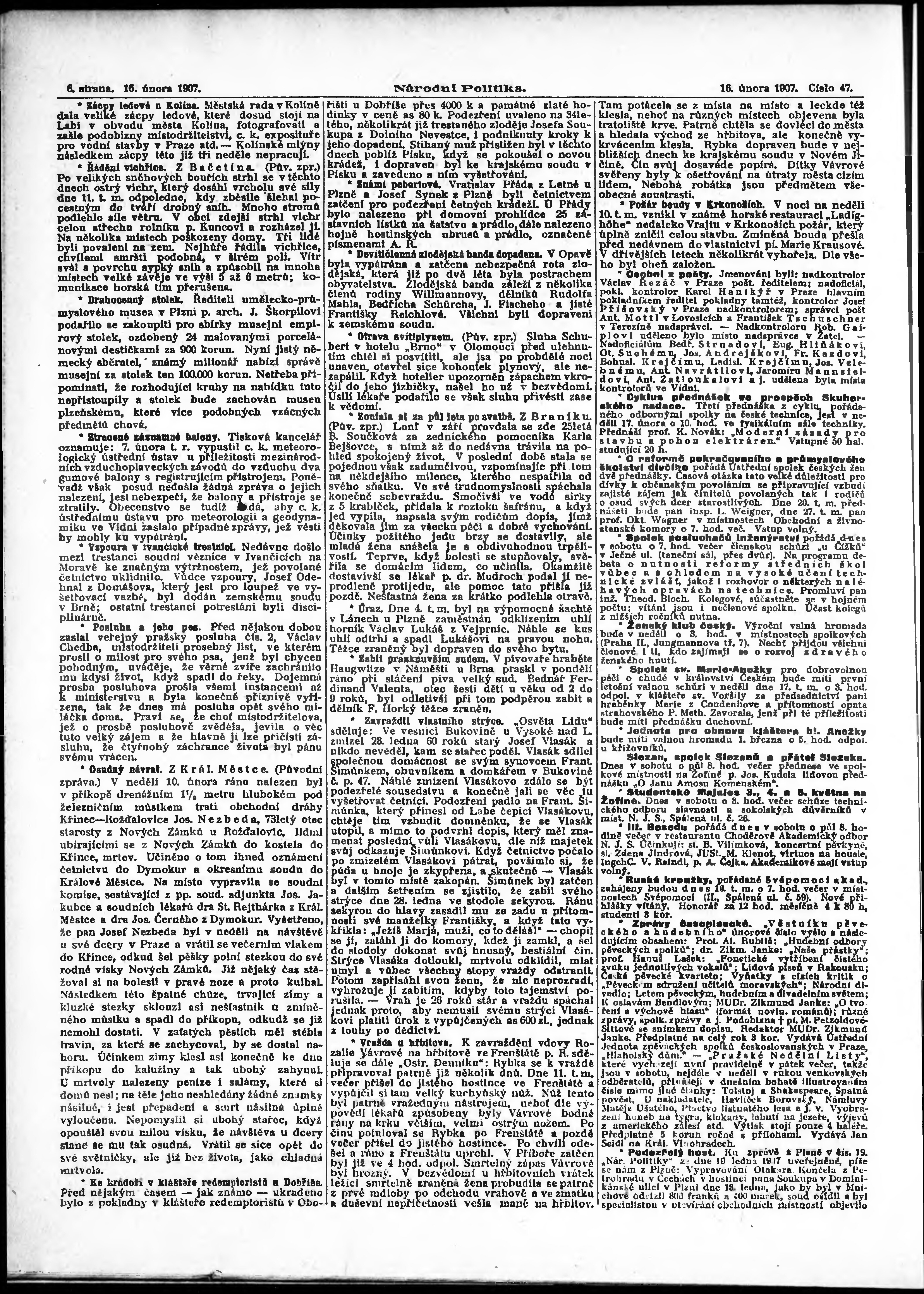 * Datum vydání výtisku: 16.2.1907 Číslo výtisku: 47 Poznámky k výtisku: ranní vydání;
