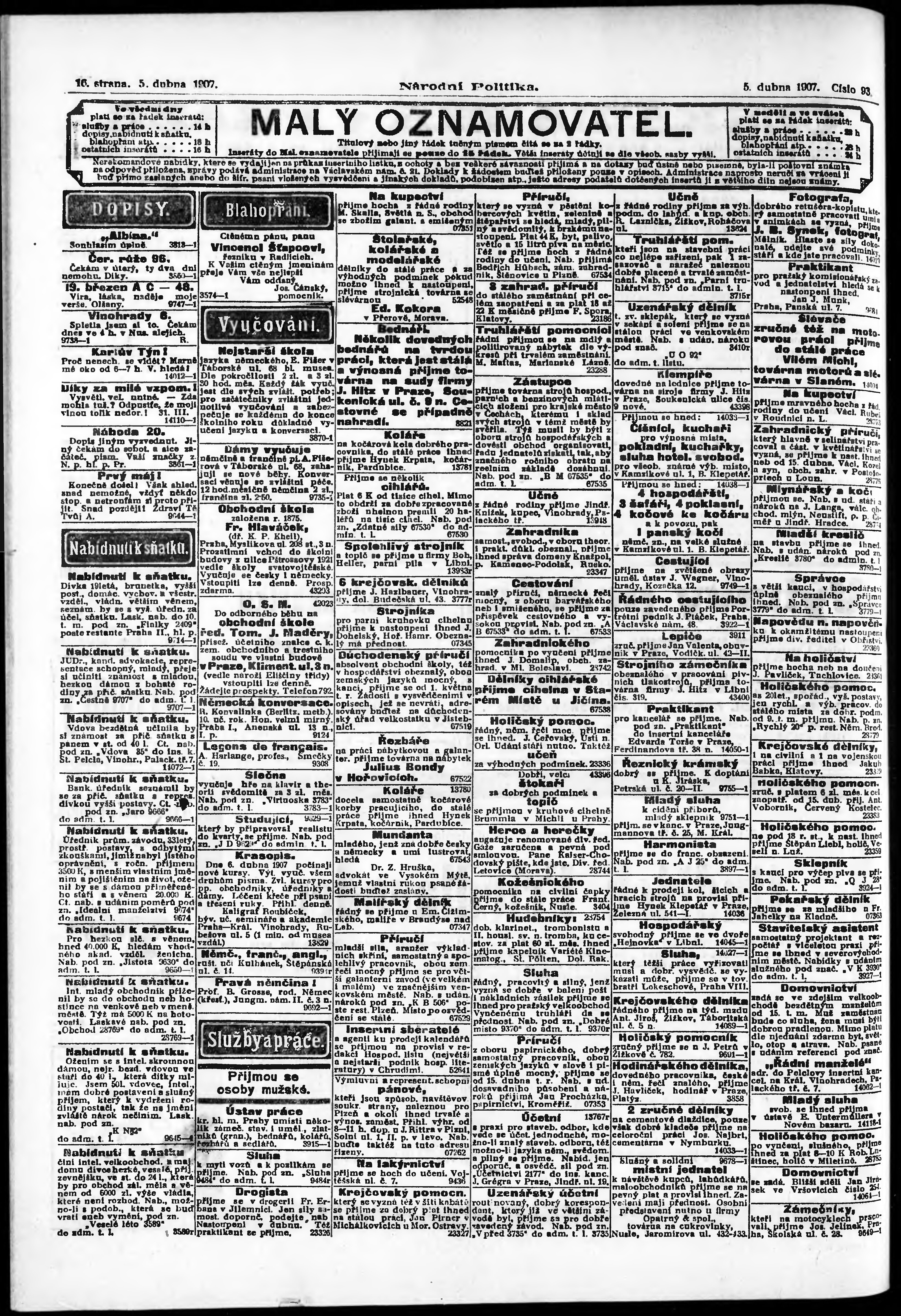 * Datum vydání výtisku: 5.4.1907 Číslo výtisku: 93 Poznámky k výtisku: ranní vydání;