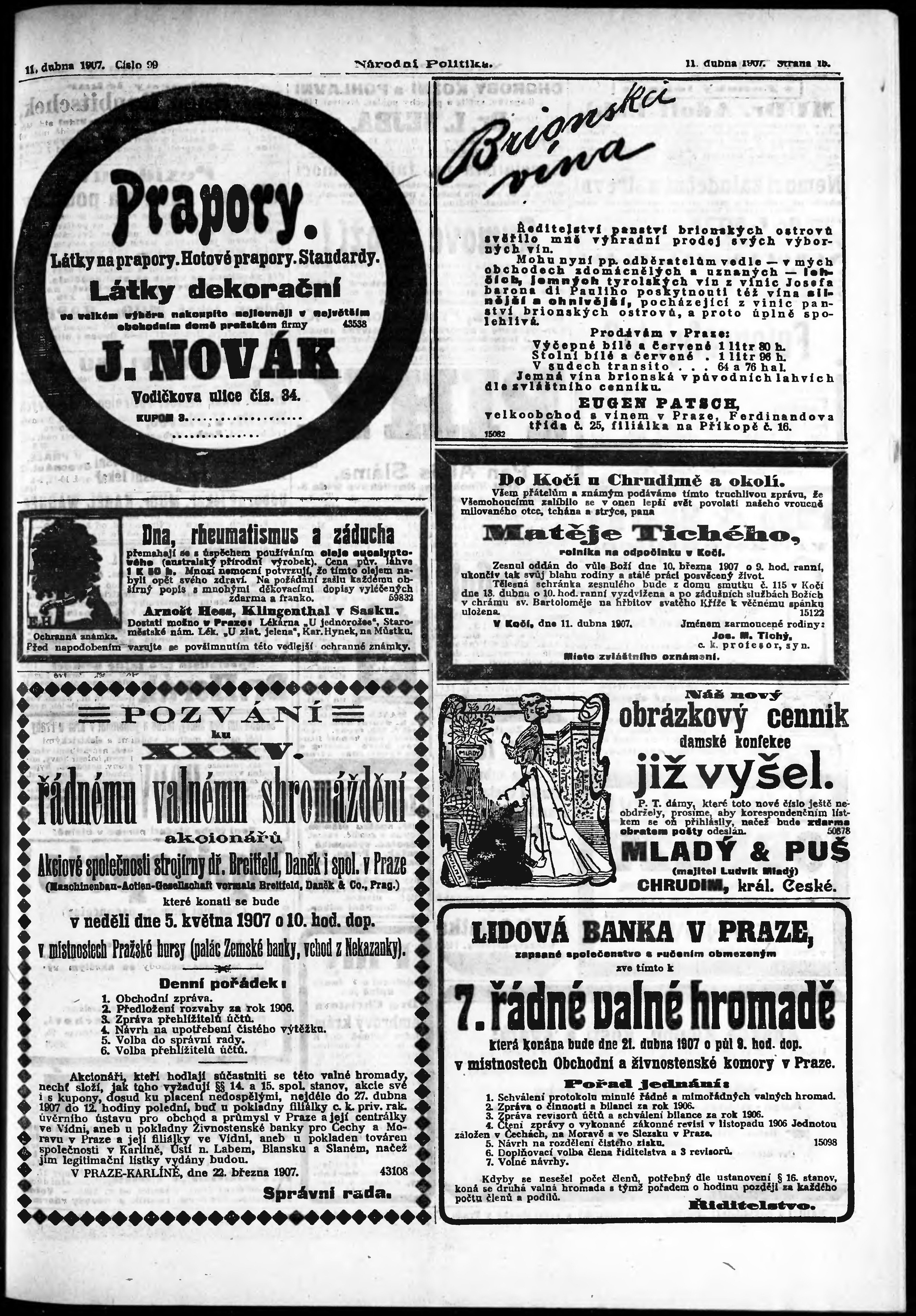 * Datum vydání výtisku: 11.4.1907 Číslo výtisku: 99 Poznámky k výtisku: ranní vydání;