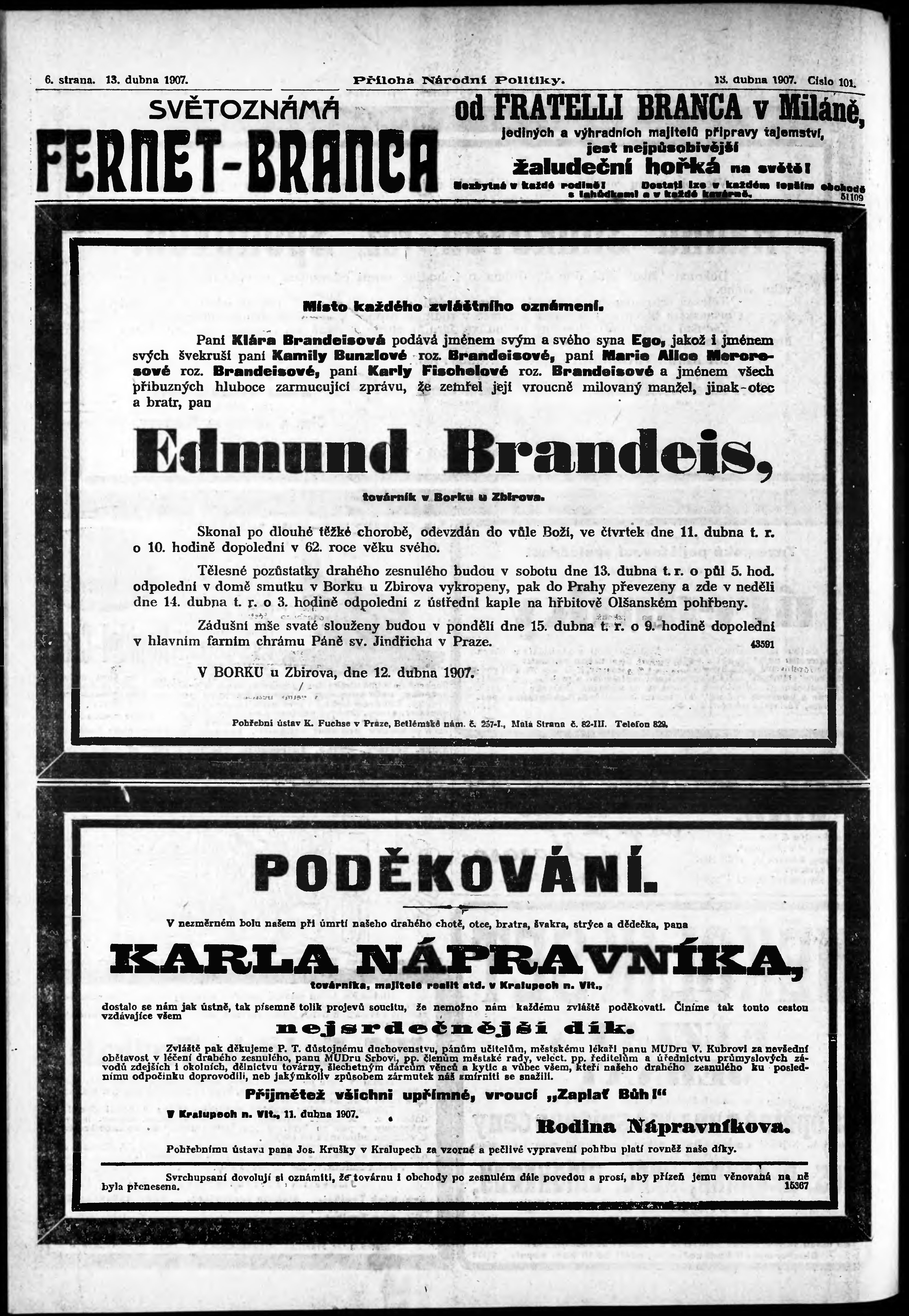 * Datum vydání výtisku: 13.4.1907 Číslo výtisku: 101 Typ výtisku: příloha