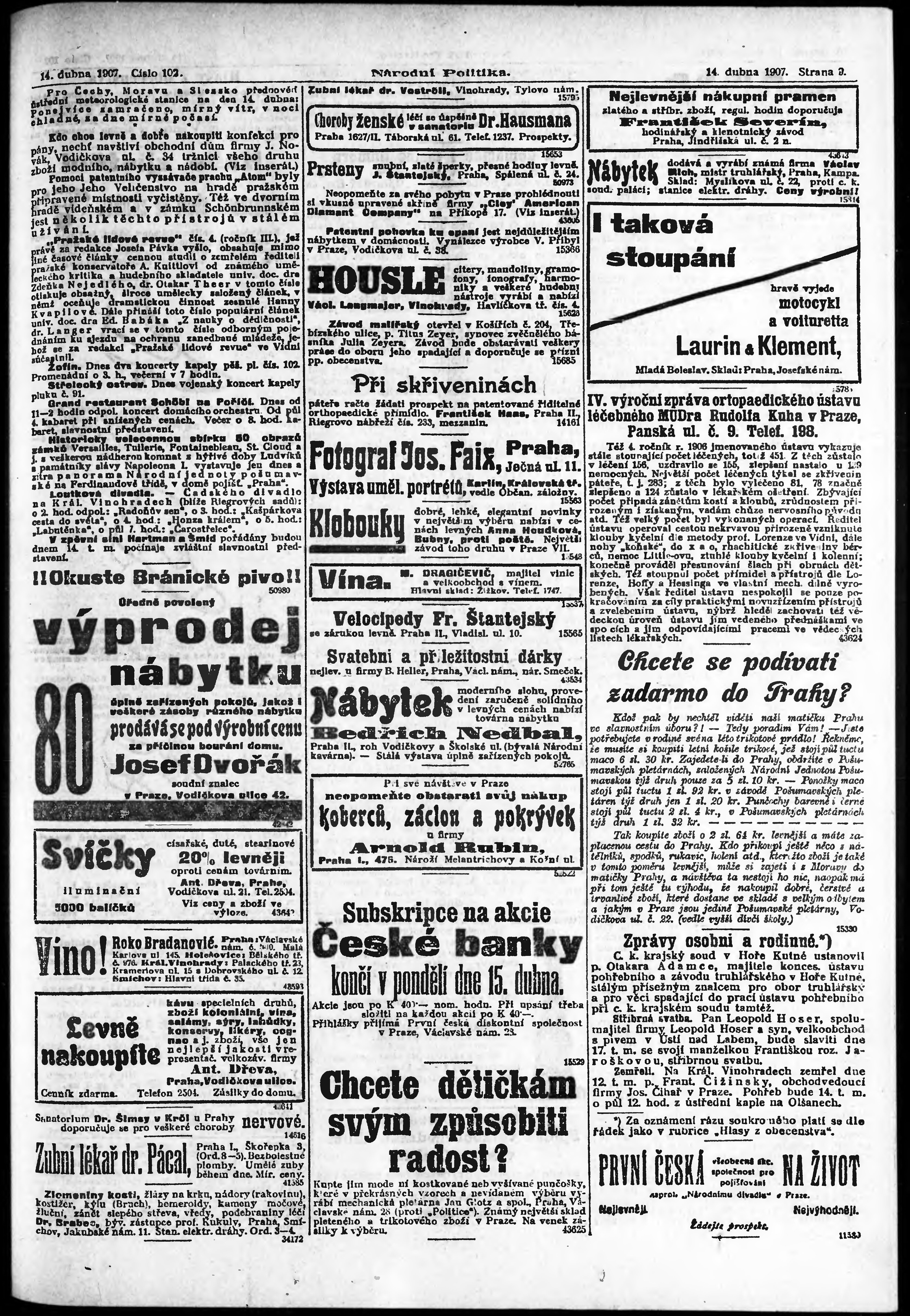 * Datum vydání výtisku: 14.4.1907 Číslo výtisku: 102 Poznámky k výtisku: ranní vydání;