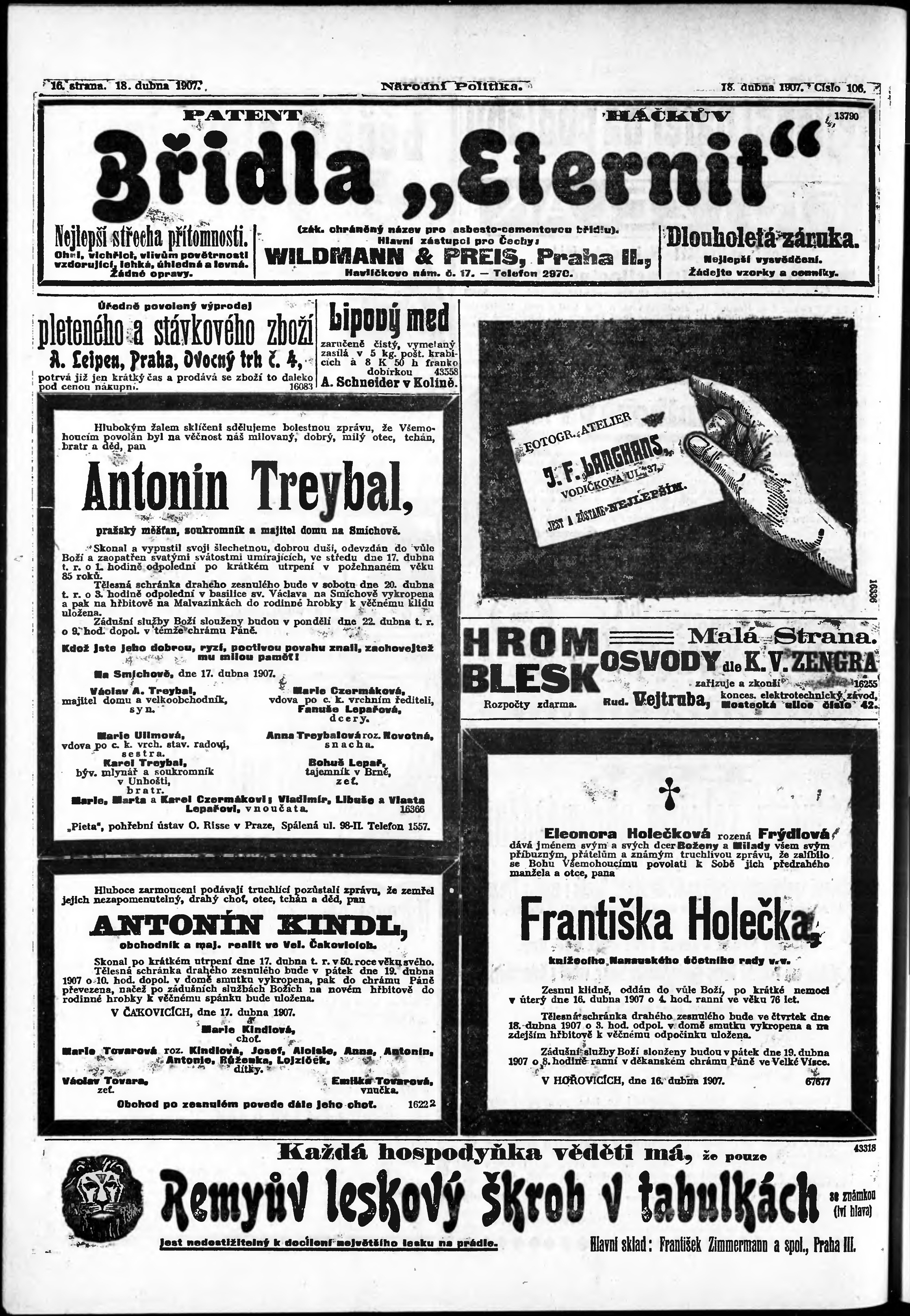 * Datum vydání výtisku: 18.4.1907 Číslo výtisku: 106 Poznámky k výtisku: ranní vydání;
