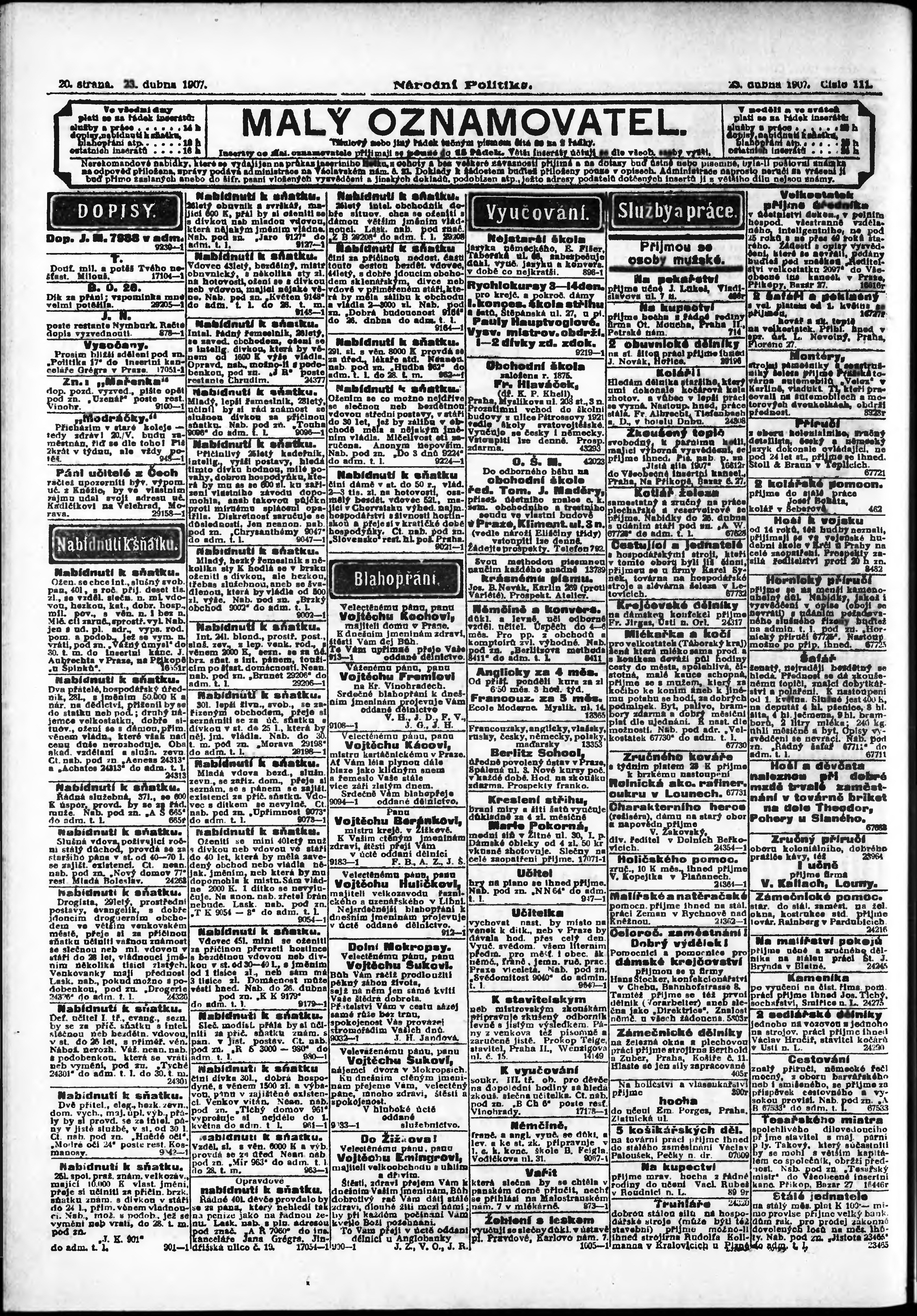 * Datum vydání výtisku: 23.4.1907 Číslo výtisku: 111 Poznámky k výtisku: ranní vydání;