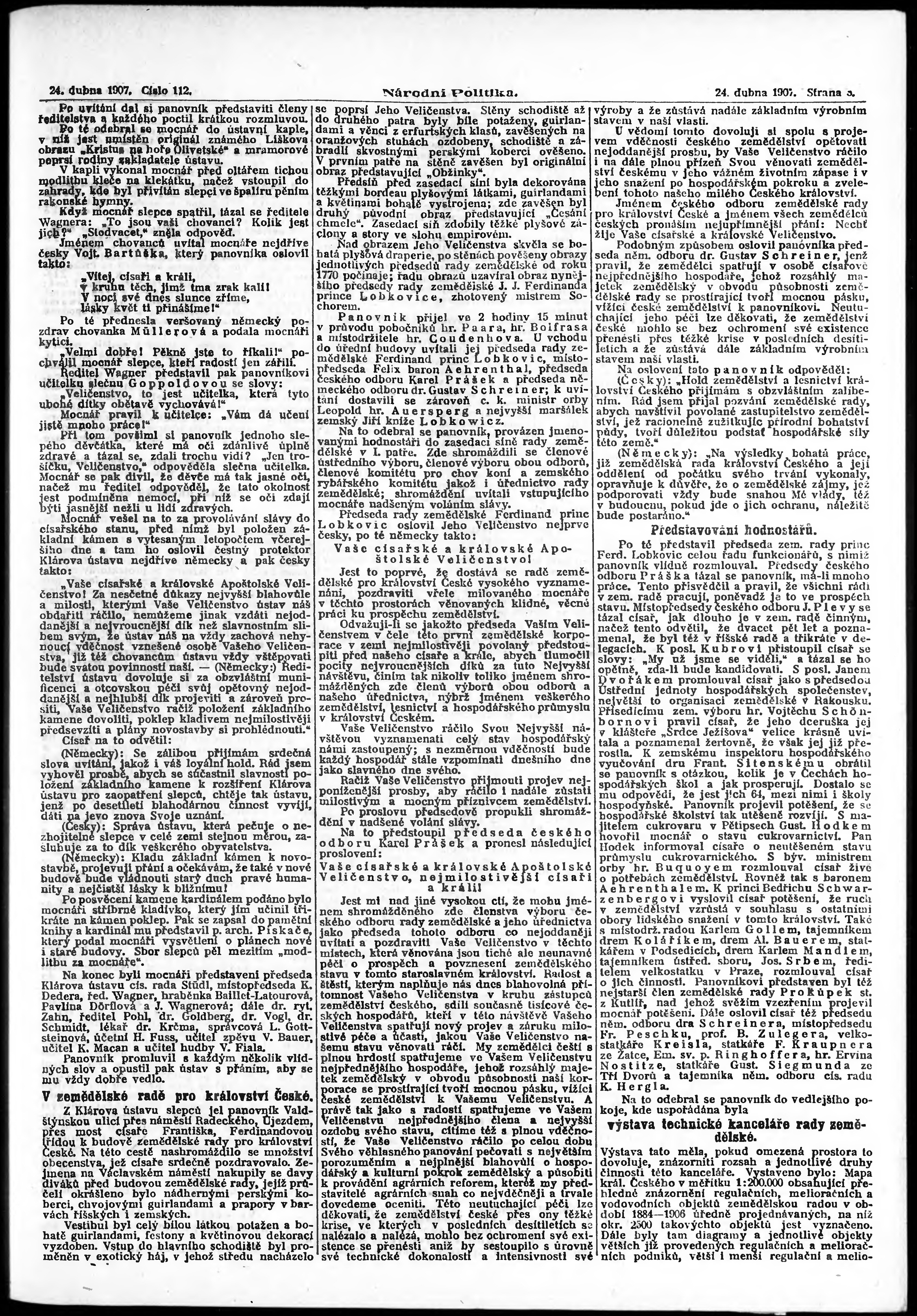 * Datum vydání výtisku: 24.4.1907 Číslo výtisku: 112 Poznámky k výtisku: ranní vydání;